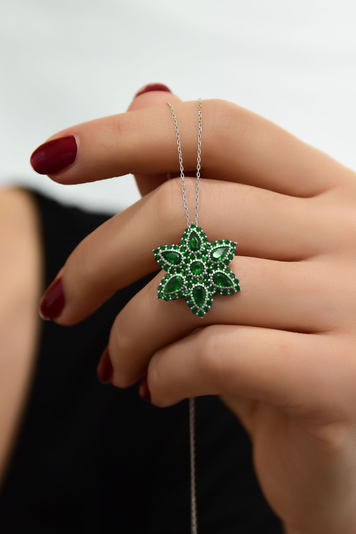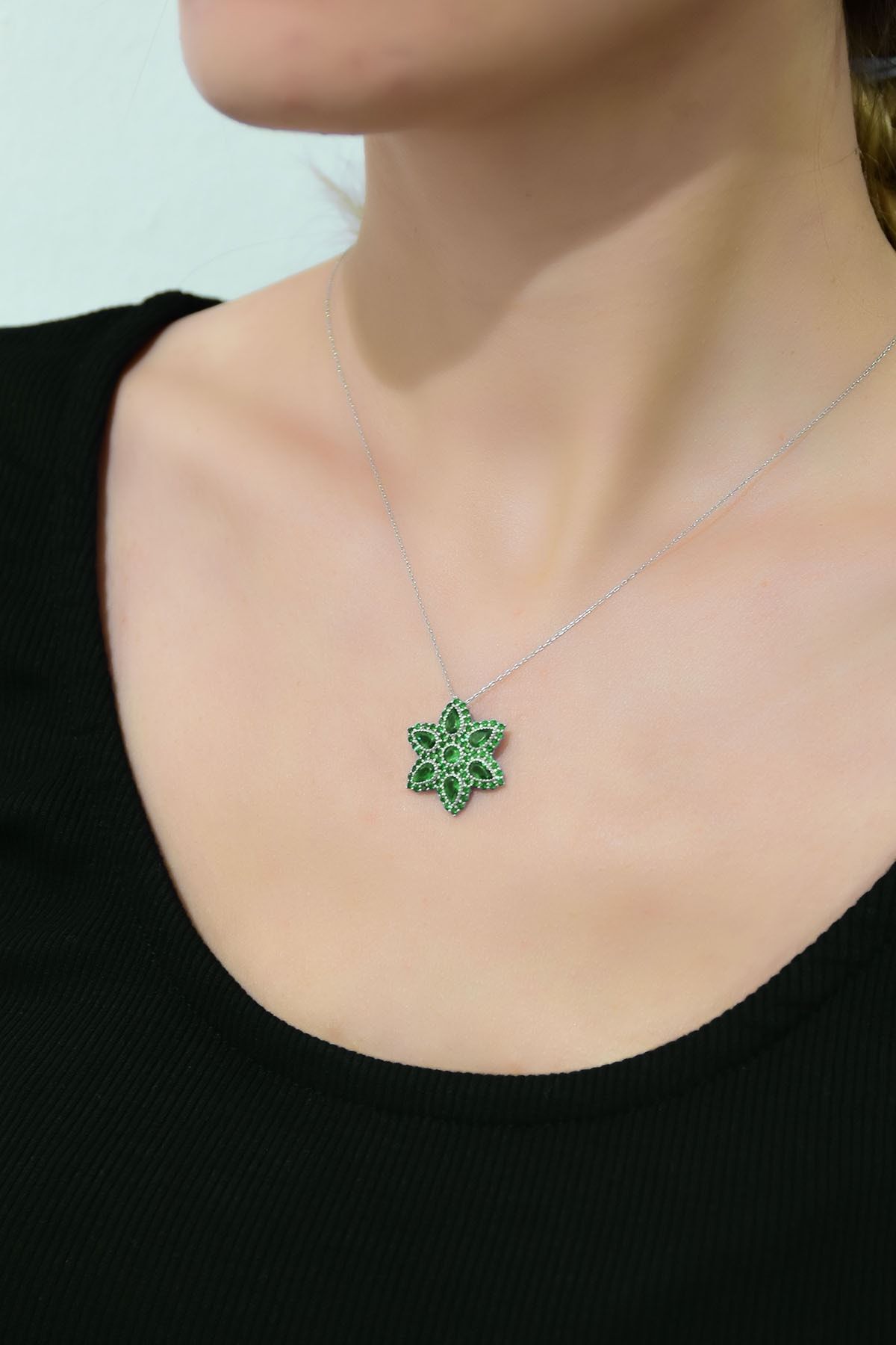 925 Ayar Gümüş Rodyum Kaplama Zümrüt Yeşili Damla Lotus Kolye