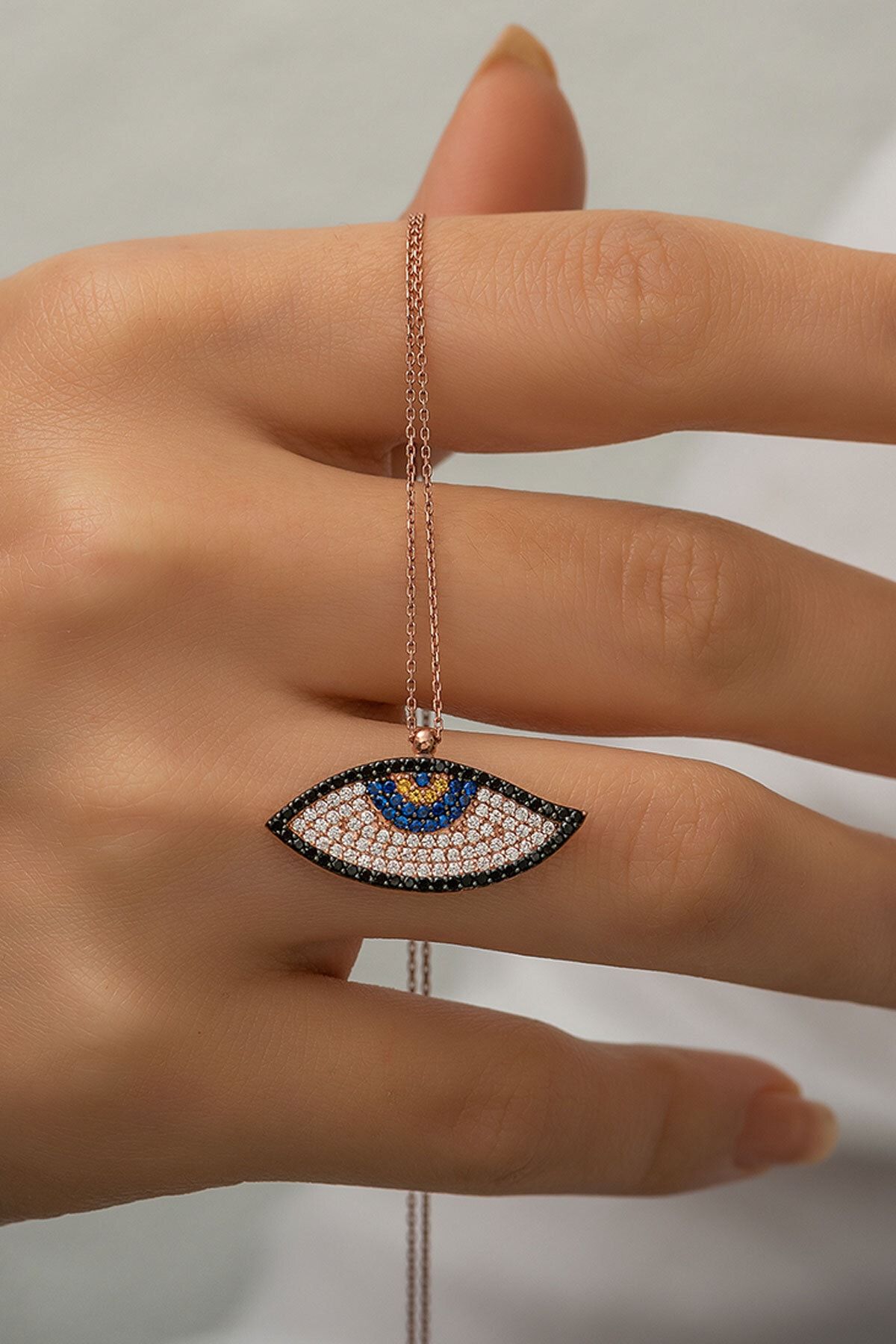 925 Ayar Gümüş Rose Altın Kaplama Göz KolyeMaden : 925 Ayar Gümüş.Kaplama : Rose Altın.Renk: Altın.Taş:, Zirkon.Kolye Zincir Uzunluğu : 42 cm.Ürün ağırlığı : 4,0 Gr ( +-). Gümüş ve değerli taşlar nedeniyle belirtilen ortalama ürün ağırlığında ± %5 sapma olabilmektedir.Teslimat :Ürün hediye kutusunda gönderilecektir.