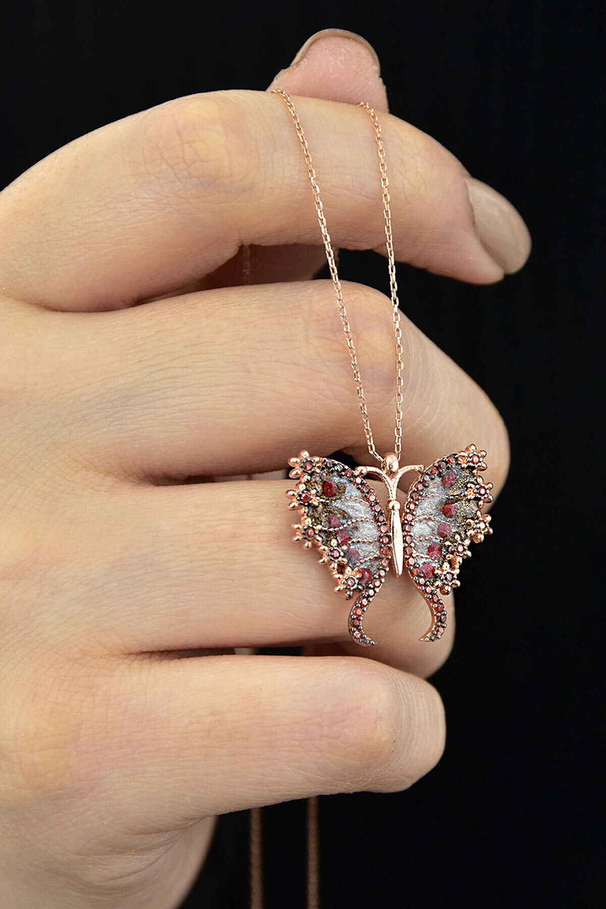 Etiketler925 Ayar Gümüş Rose Altın Kaplama Mineli Kelebek Kolye