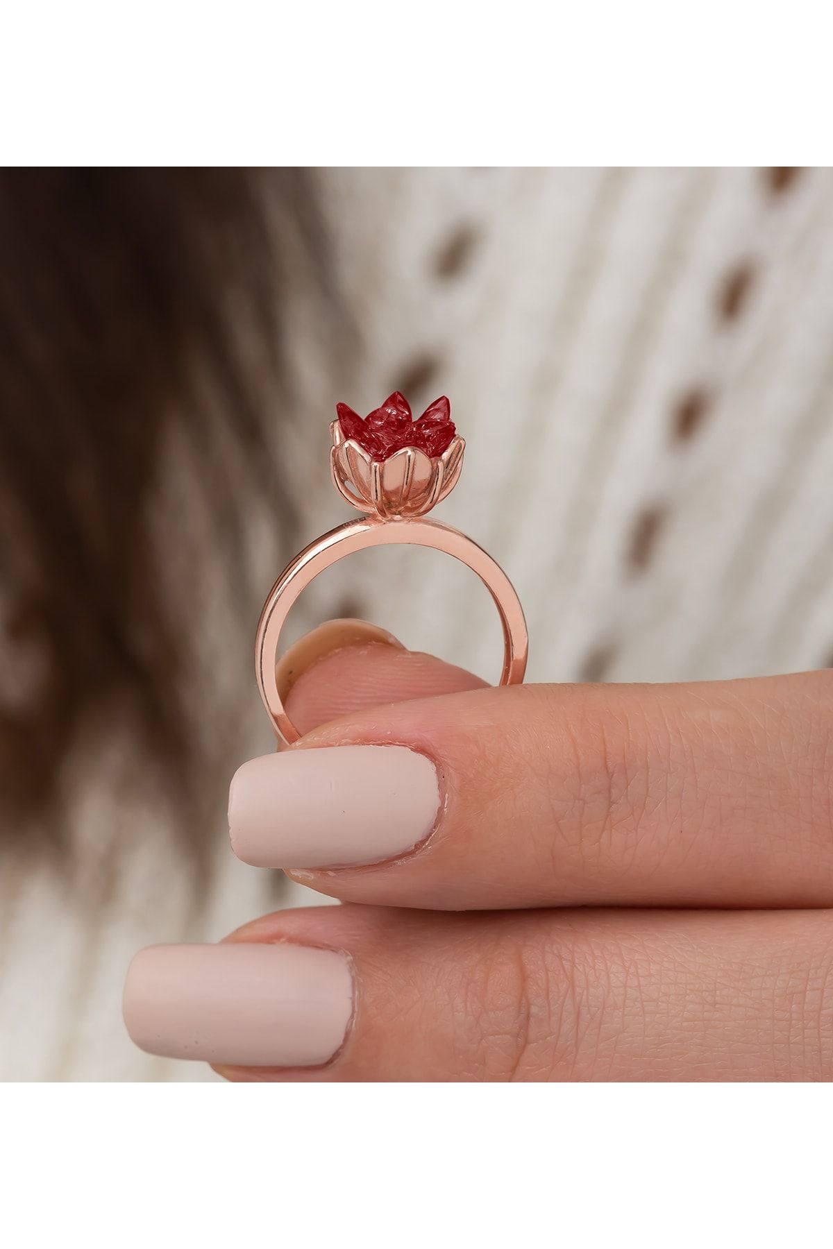 925 Ayar Gümüş Rose Kaplama Ayarlanabilir Kırmızı Lotus Çiçeği Yüzük
