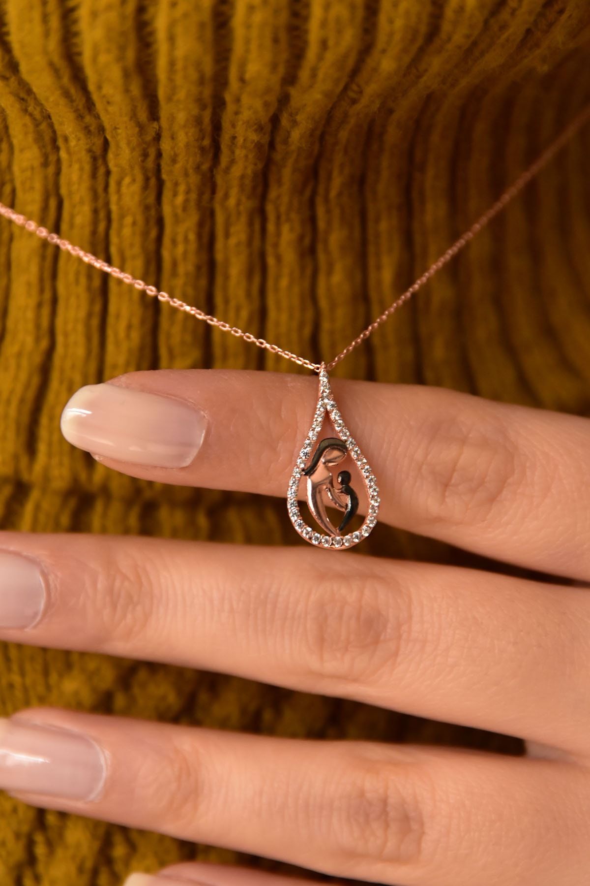 Etiketler925 Ayar Gümüş Rose Kaplama Beyaz Taşlı Anne Çocuk Damla Kadın Kolye