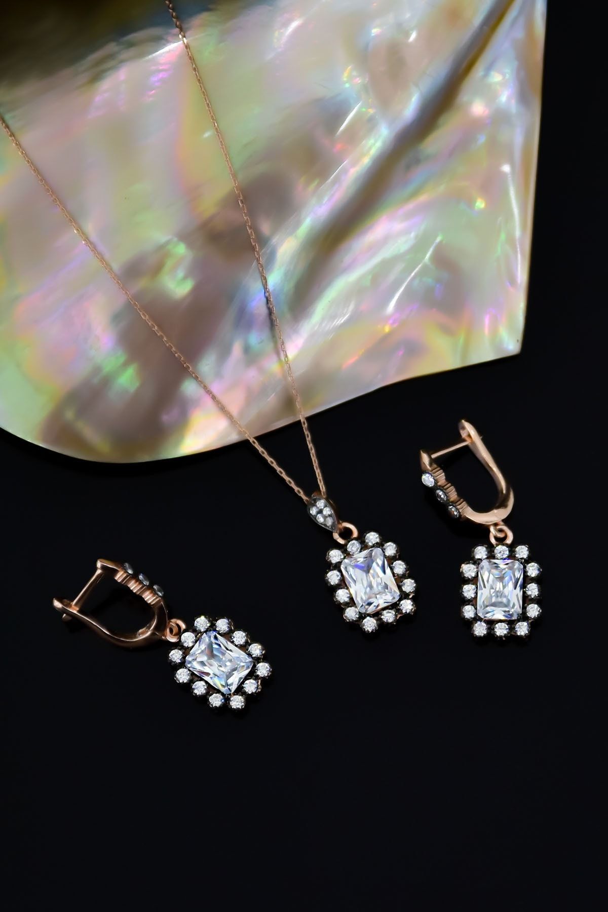 Maden : 925 Ayar Gümüş. Kaplama: Rose. Taş: Zirkon. Kolye En x Boy: 1*2 cm. Ürün Ağırlığı : 8,61 Gr ( +-). Zincir Uzunluğu: 42 cm. Küpe En*Boy: 1*2,7 cm. Gümüş ve değerli taşlar nedeniyle belirtilen ortalama ürün ağırlığında ± %5 sapma olabilmektedir. Teslimat: Ürün ahşap hediye kutusunda gönderilecektir. Kullanım: Parfüm, dezenfektan, çamaşır suyu gibi kimyasallardan uzak tutunuz.