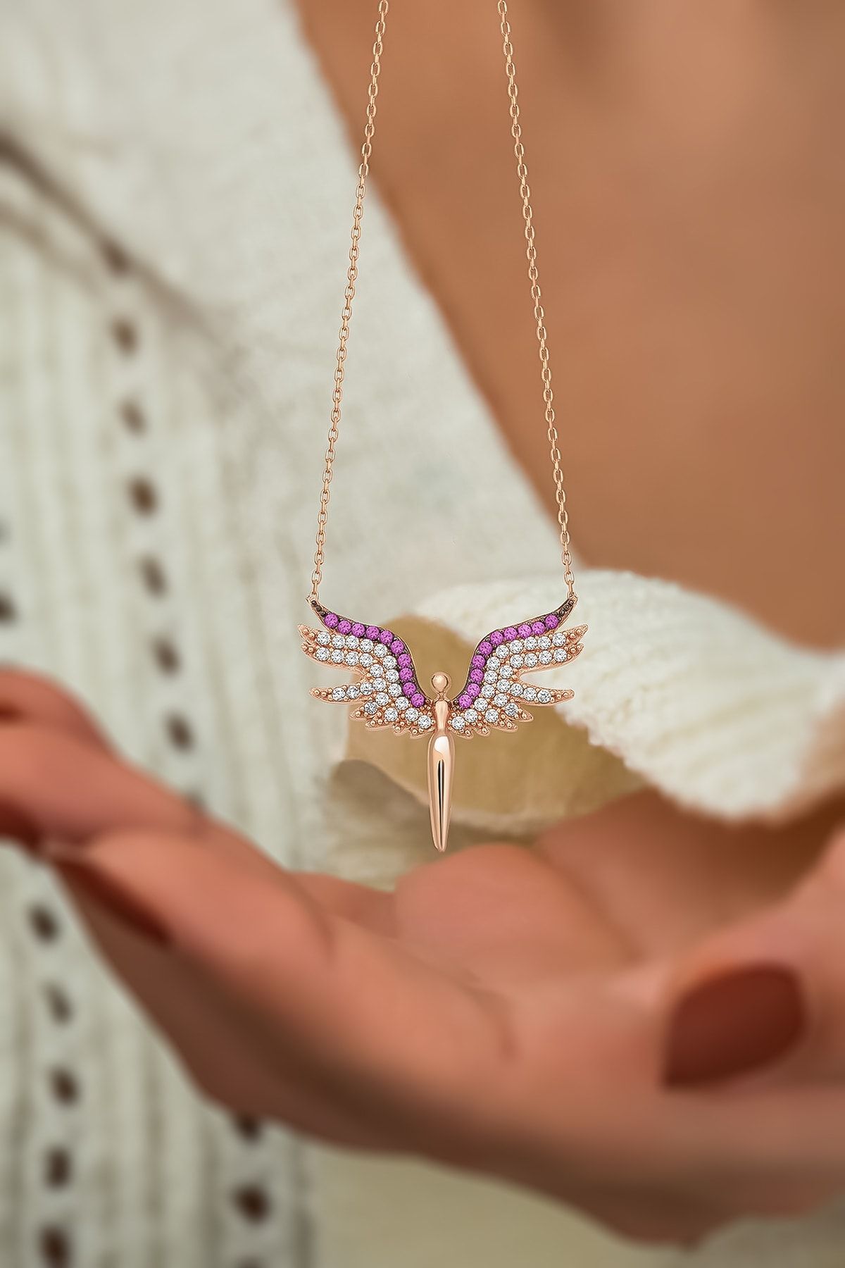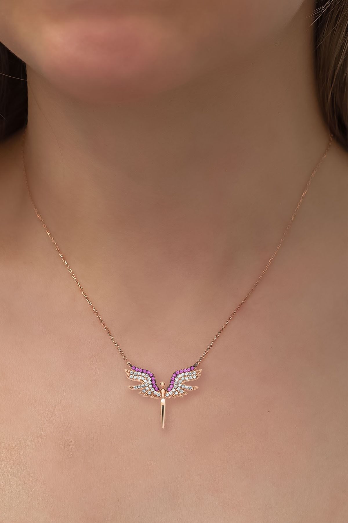 925 Ayar Gümüş Rose Kaplama Fuşya Zirkon Taşlı Mikail Meleği Kolye