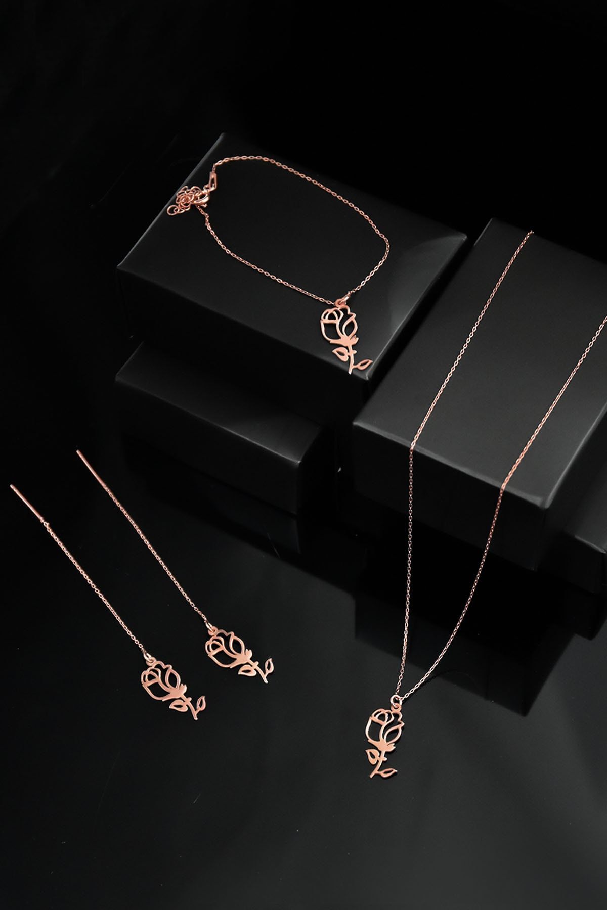 Maden : 925 Ayar Gümüş.Kaplama: Rose Altın.En x Boy: 1,0 x 2,0 cm.Kolye Zincir Uzunluğu: 42 cm.Bileklik Zincir Uzunluğu: 18 cm.Küpe Zincir Uzunluğu: 8 cm.Ürün Ağırlığı 2,80 Gr ( +-). Gümüş ve değerli taşlar nedeniyle belirtilen ortalama ürün ağırlığında ± %5 sapma olabilmektedir.Teslimat: Ürün ahşap hediye kutusunda gönderilecektir.
