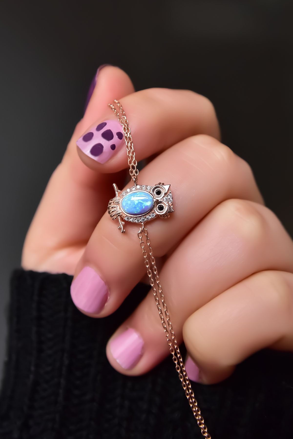 Etiketler925 Ayar Gümüş Rose Kaplama Mavi Opal Baykuş Bileklik
