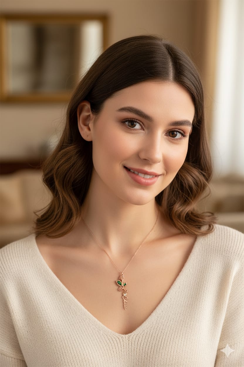 Maden : 925 Ayar Gümüş. Kaplama: Rose . En x Boy: 1,0 x 4,0 cm (-+). Zincir Uzunluğu: 42 cm. Ürün Ağırlığı : 2,74 Gr ( +-). Ürün Ebat ve Ağırlık bilgileri isme göre değişiklik göstermektedir. Gümüş ve değerli taşlar nedeniyle belirtilen ortalama ürün ağırlığında ± %5 sapma olabilmektedir. Teslimat: Ürün ahşap hediye kutusunda gönderilecektir. Kullanım: Parfüm, dezenfektan, çamaşır suyu gibi kimyasallardan uzak tutunuz.