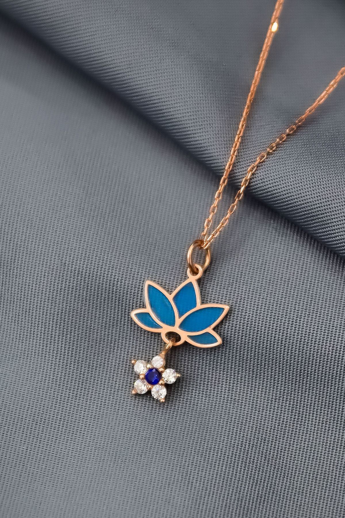 925 Ayar Gümüş Rose Kaplama Parlayan Rüya Serisi Tasarım Ebruli Mavi Cam Boyalı Çiçek, Lotus Kolye