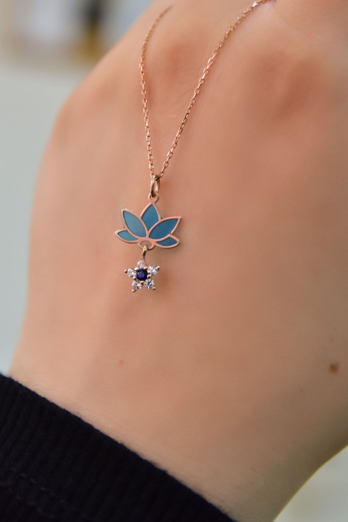 Etiketler925 Ayar Gümüş Rose Kaplama Parlayan Rüya Serisi Tasarım Ebruli Mavi Cam Boyalı Çiçek, Lotus Kolye
