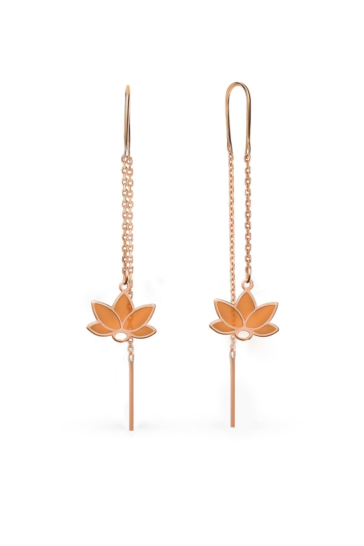 925 Ayar Gümüş Rose Kaplama Parlayan Rüya Serisi Tasarım Turuncu Cam Boyalı Lotus Zincir Küpe