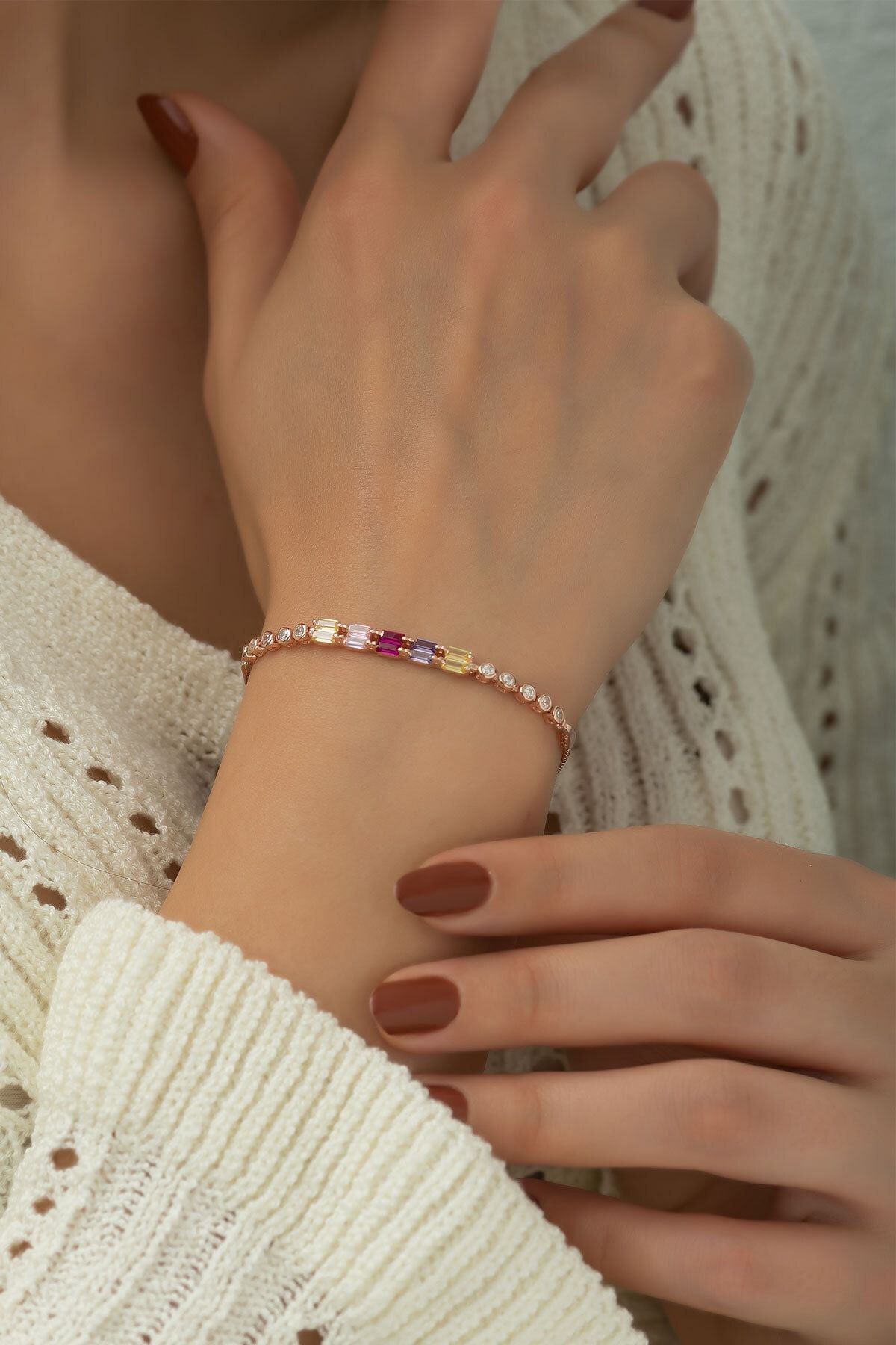 Etiketler925 Ayar Gümüş Rose Kaplama Renkli Baget Taşlı Su Yolu Bileklik