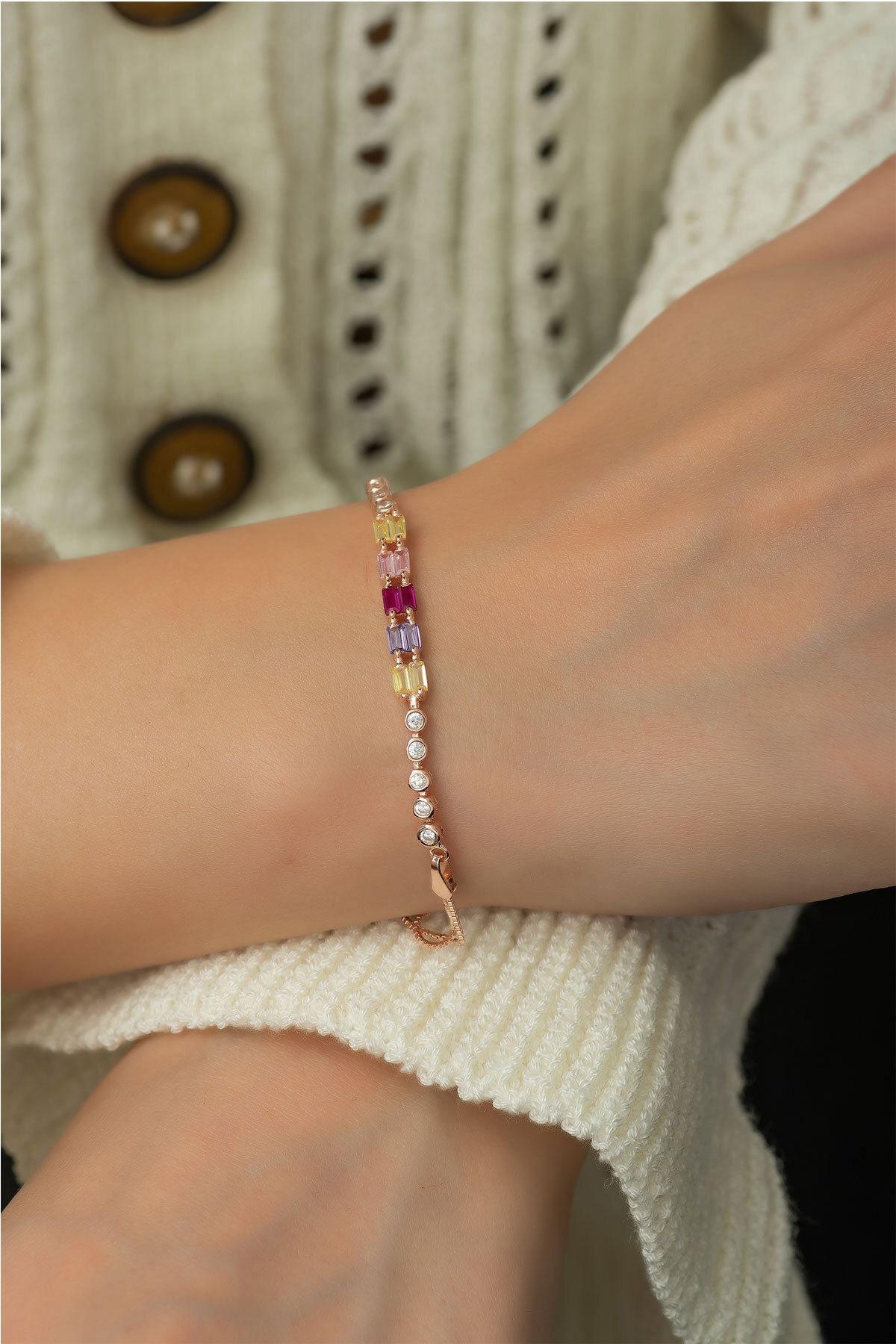925 Ayar Gümüş Rose Kaplama Renkli Baget Taşlı Su Yolu Bileklik