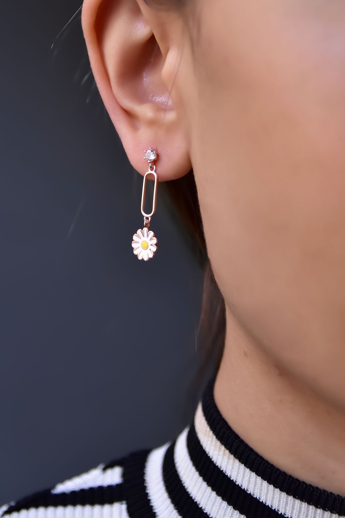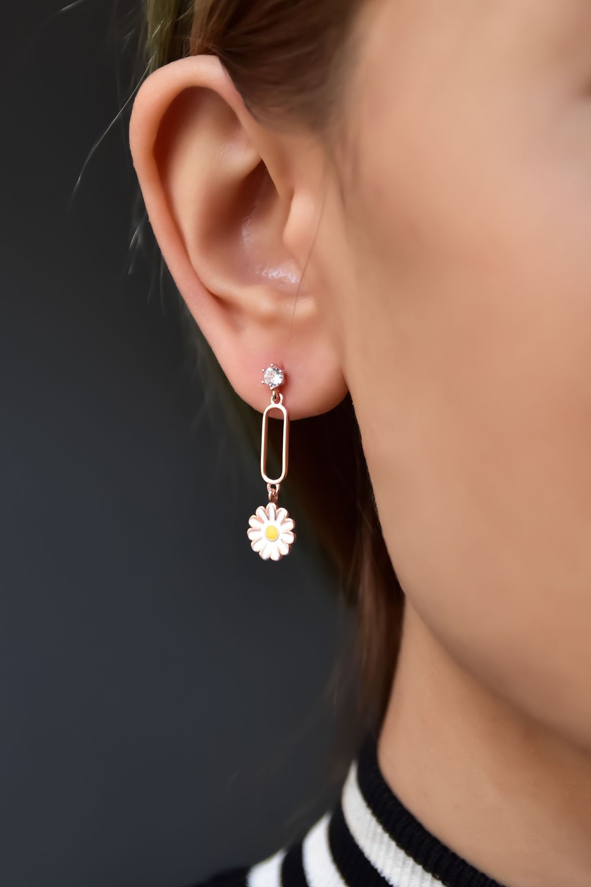 Etiketler925 Ayar Gümüş Rose Kaplama Sallantılı Köşesiz Dikdörtgen Tektaş Papatya Küpe