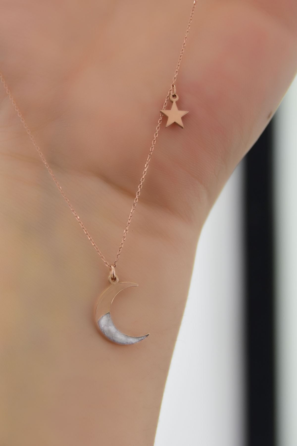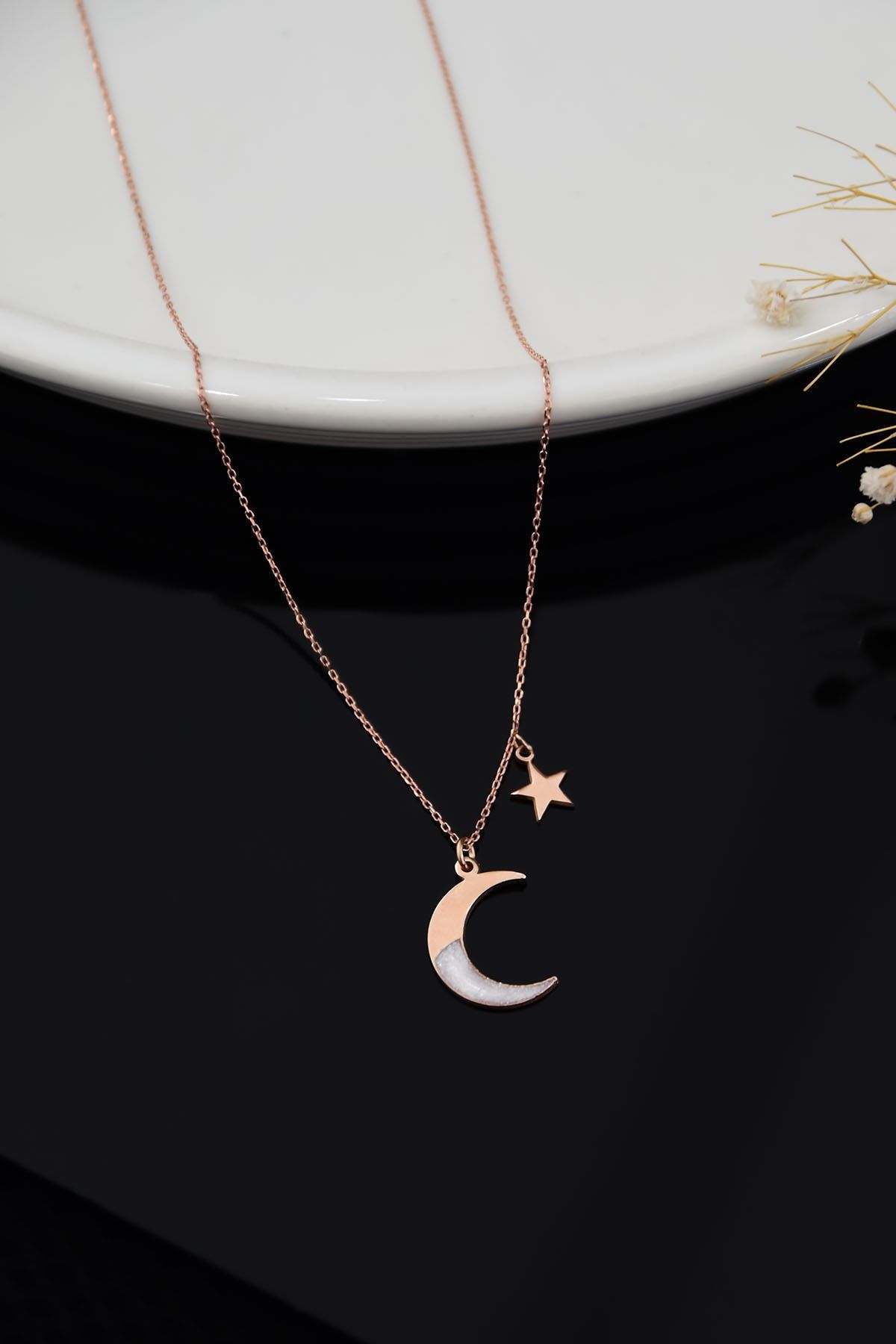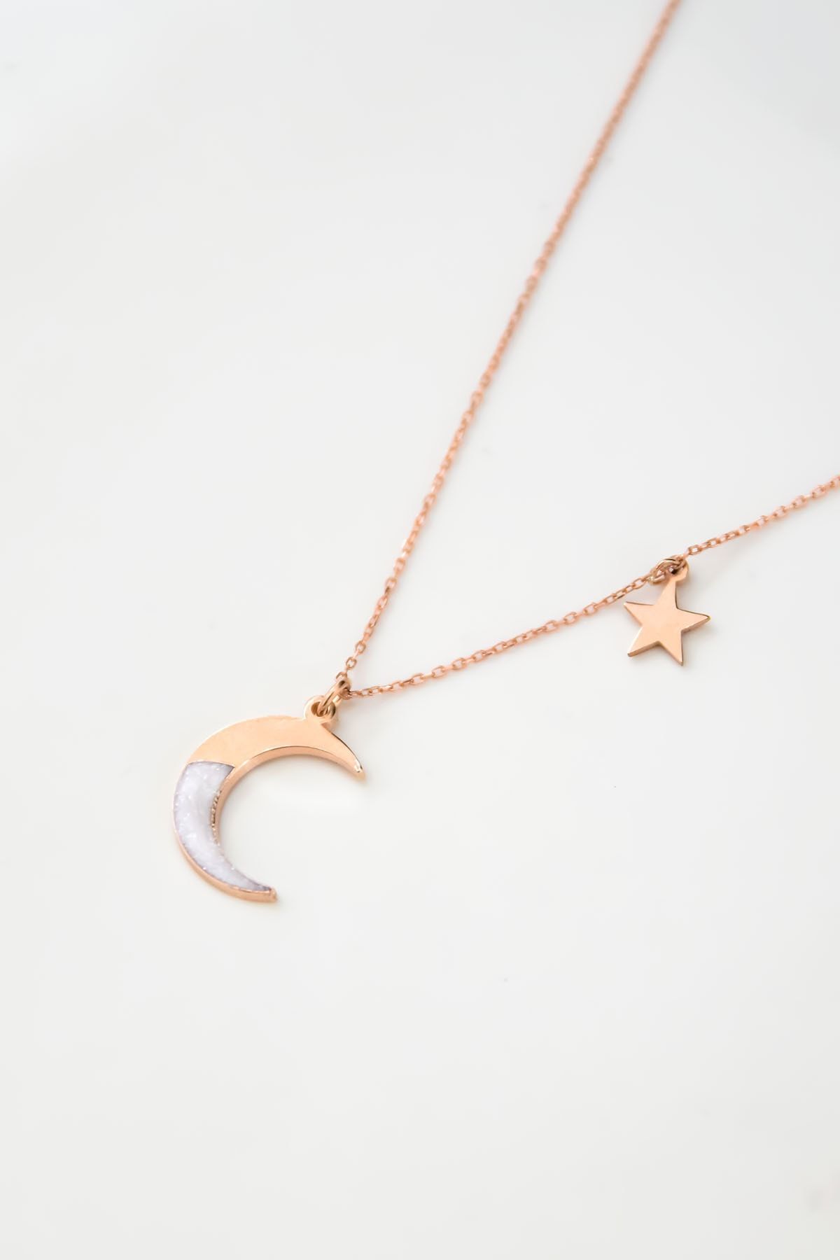 Maden:925 Ayar Gümüş. Kaplama: Rose Kaplama. Zincir:42 cm. Hilal En*Boy:1,2* 1,5 cm. Yıldız En*Boy: 6 mm. Ağırlığı : 1,54Gr ( +-). Gümüş ve değerli taşlar nedeniyle belirtilen ortalama ürün ağırlığında ± %5 sapma olabilmektedir. Teslimat: Ürün ahşap hediye kutusunda gönderilecektir. Kullanım: Parfüm, dezenfektan, çamaşır suyu gibi kimyasallardan uzak tutunuz.