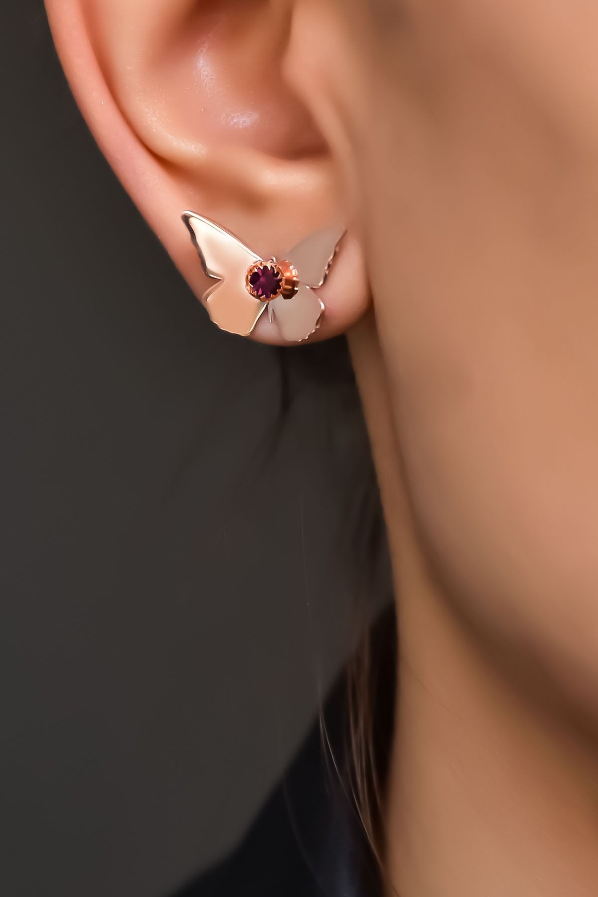 Etiketler925 Ayar Gümüş Rose Kaplama Şubat Ayı Doğum Taşlı Kelebek Küpe