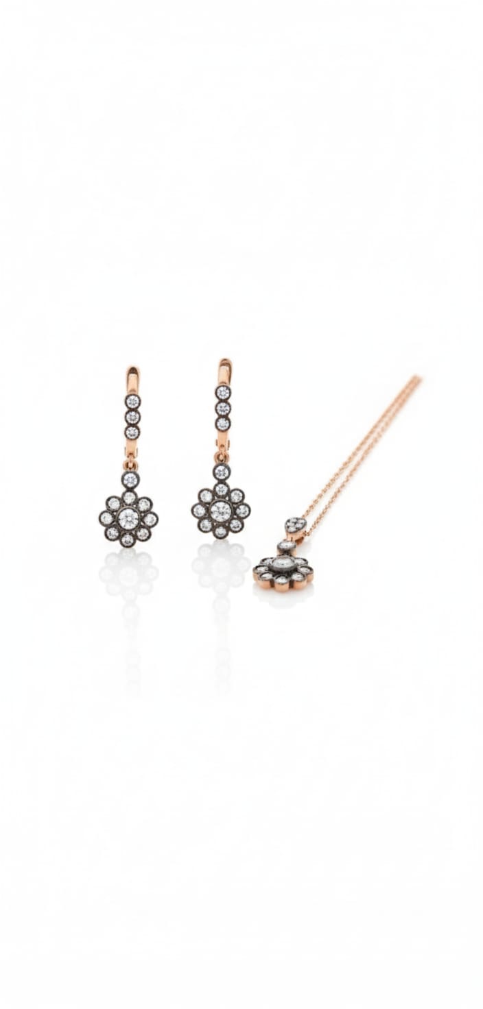 | Etiketler | 925 Ayar Gümüş Rose Kaplama Tasarım Elmas Montür Çiçek Set |