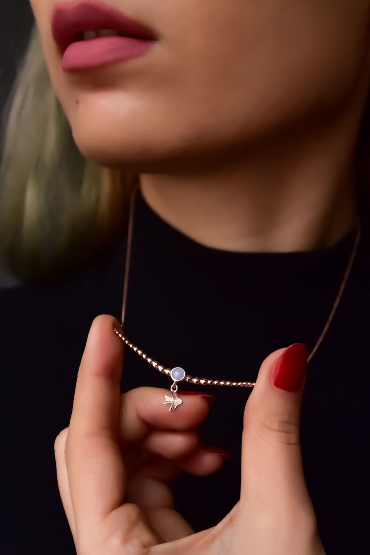 Etiketler925 Ayar Gümüş Rose Kaplama Top Motifli Lila Ay Taşı Kırlangıç Kolye
