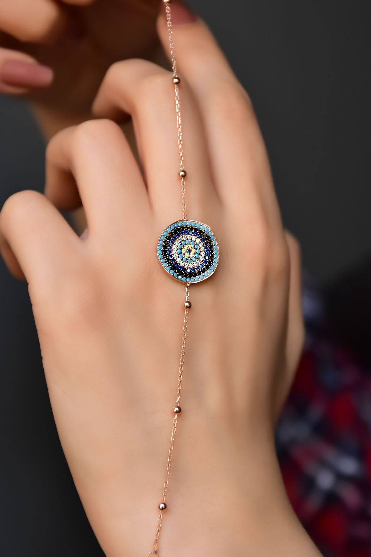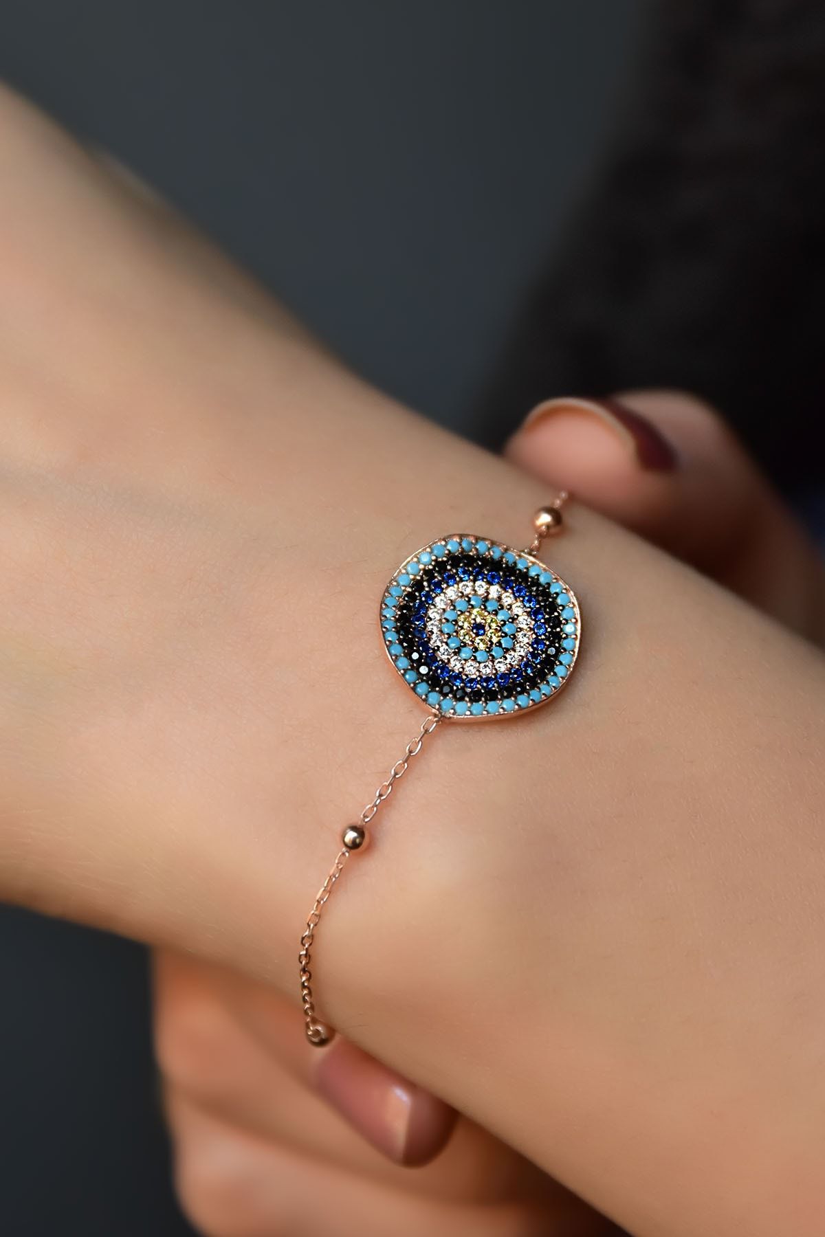 Maden : 925 Ayar Gümüş. Kaplama: Rose. Taş Cinsi: Zirkon. Taş: Zirkon. Zincir Uzunluğu: 18+3 cm. Ürün Model Ağırlıkları: 2,34 gr (-+) . Nazar En*Boy:1,6 cm. Gümüş ve değerli taşlar nedeniyle belirtilen ortalama ürün ağırlığında ± %10 sapma olabilmektedir. Teslimat: Ürün kutusunda gönderilecektir. Kullanım: Parfüm, dezenfektan, çamaşır suyu gibi kimyasallardan uzak tutunuz.
