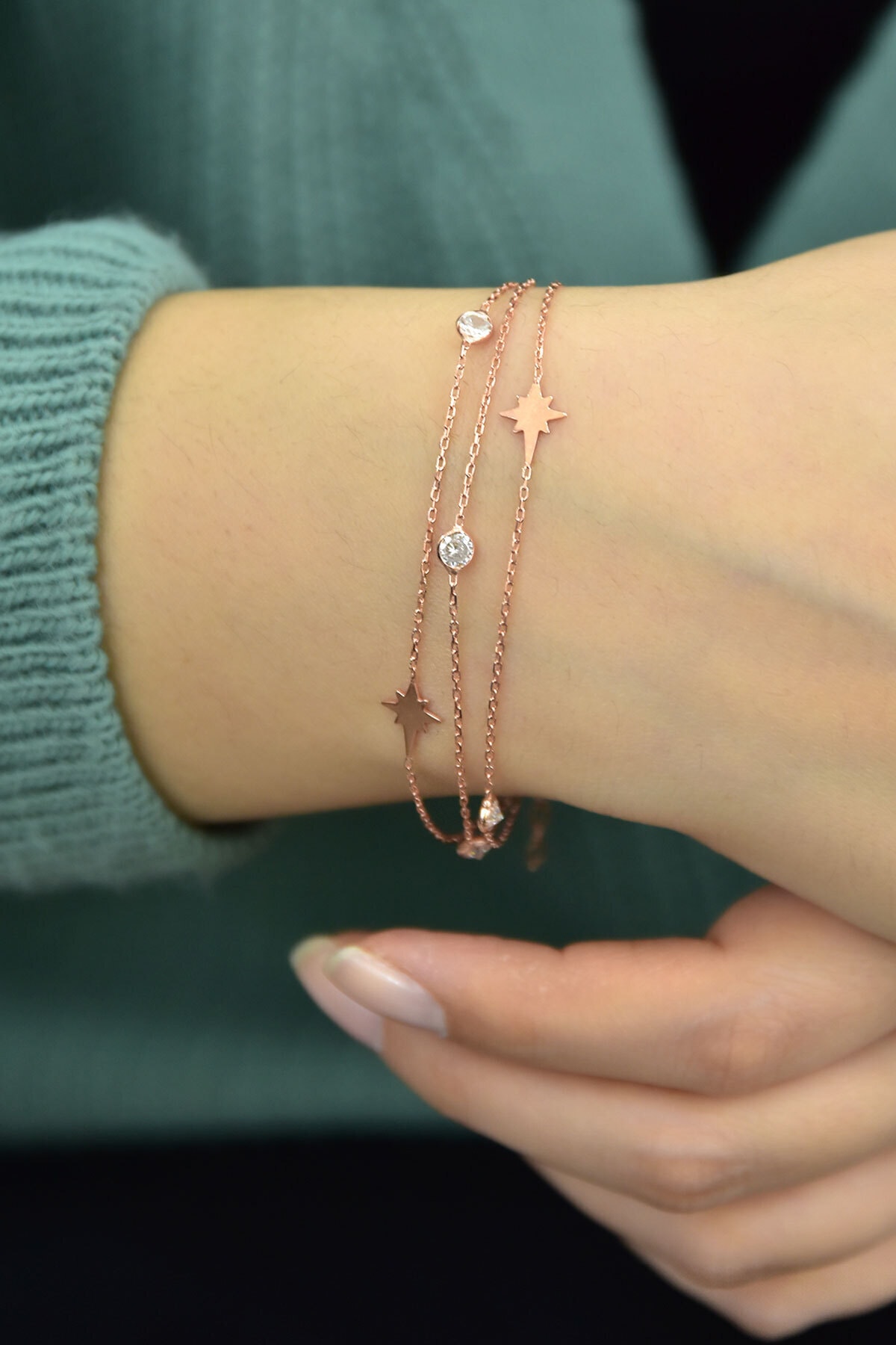 925 Ayar Gümüş Rose Kaplama Üç Zincirli Kutup Yıldızı Bileklik