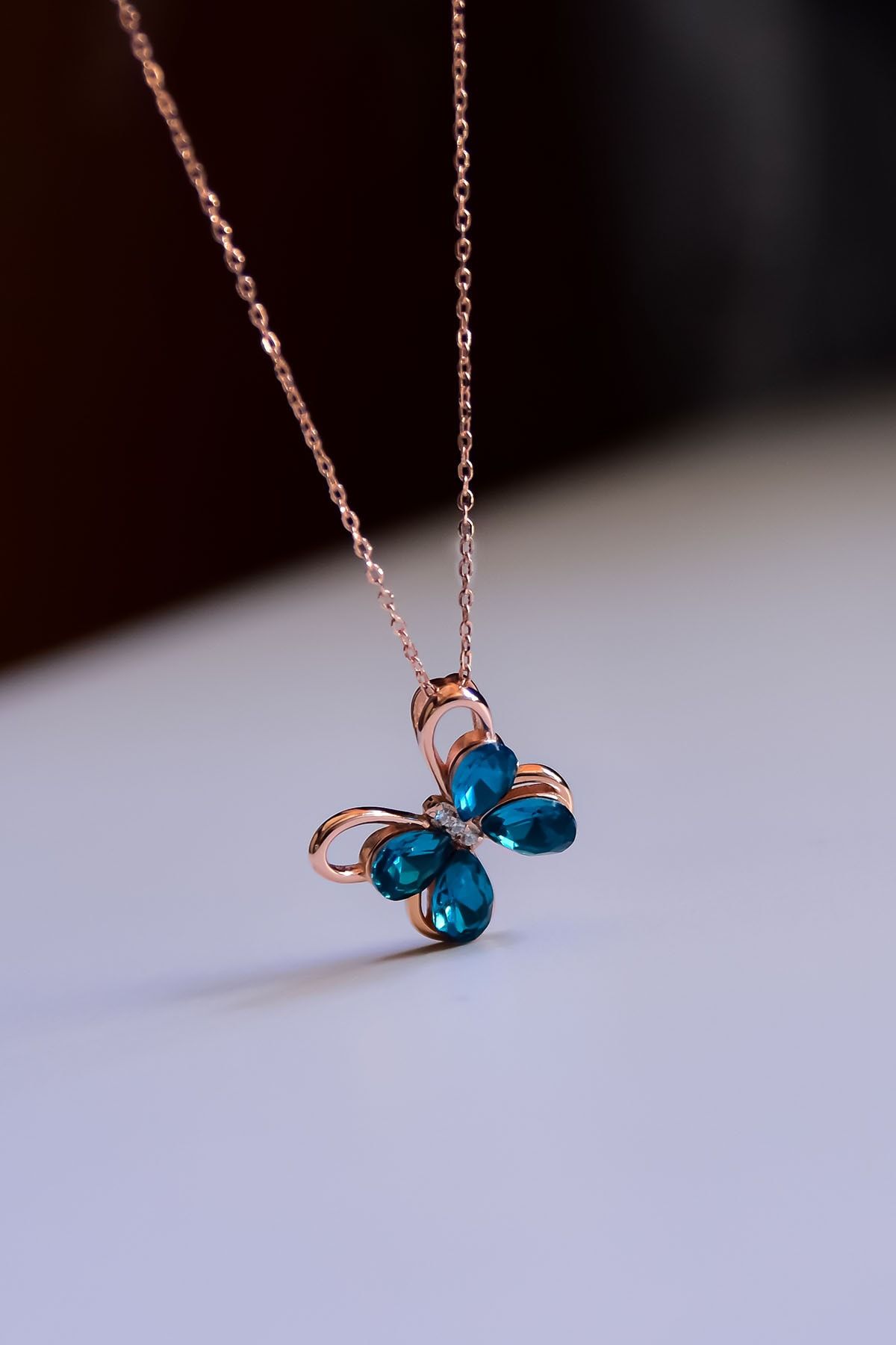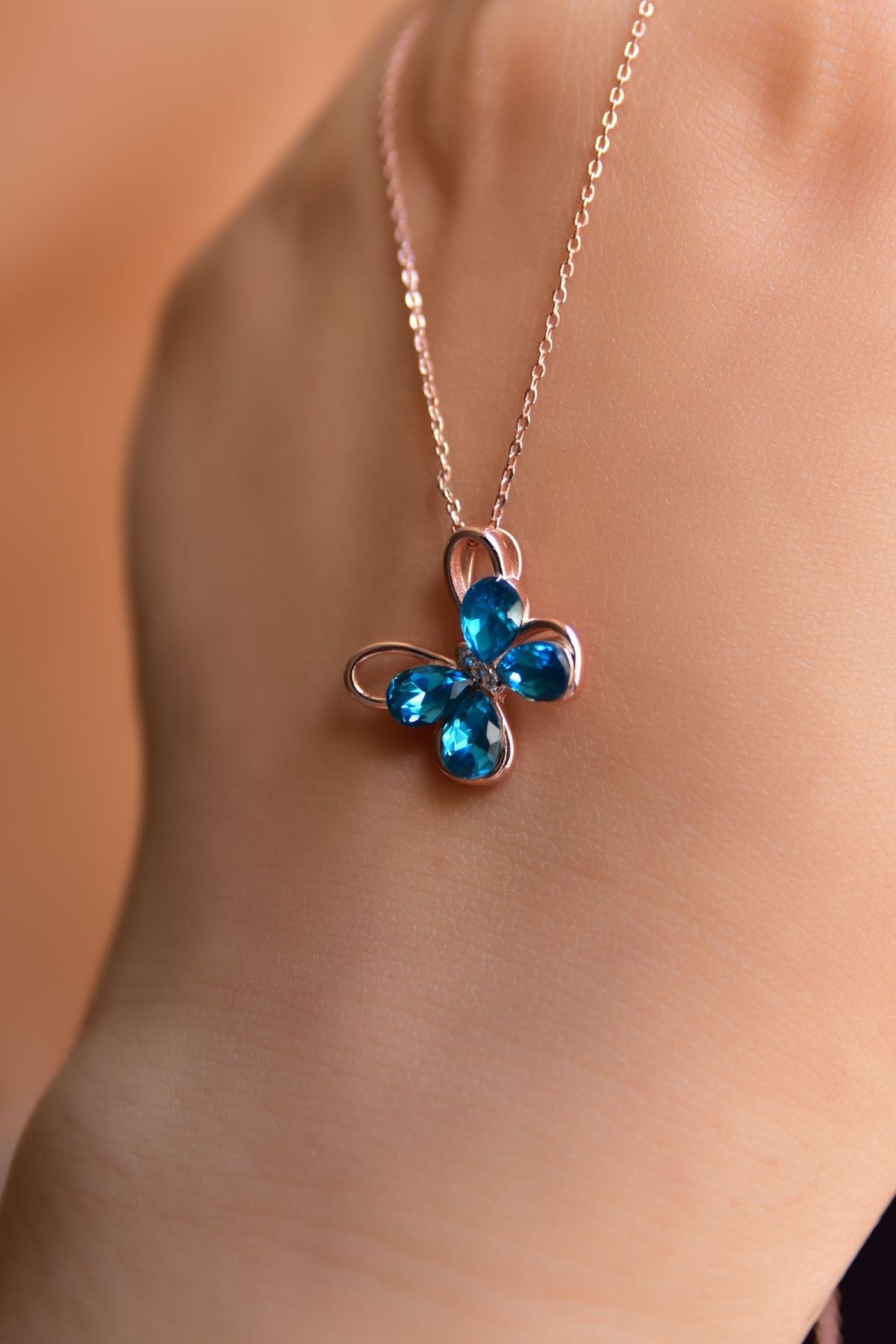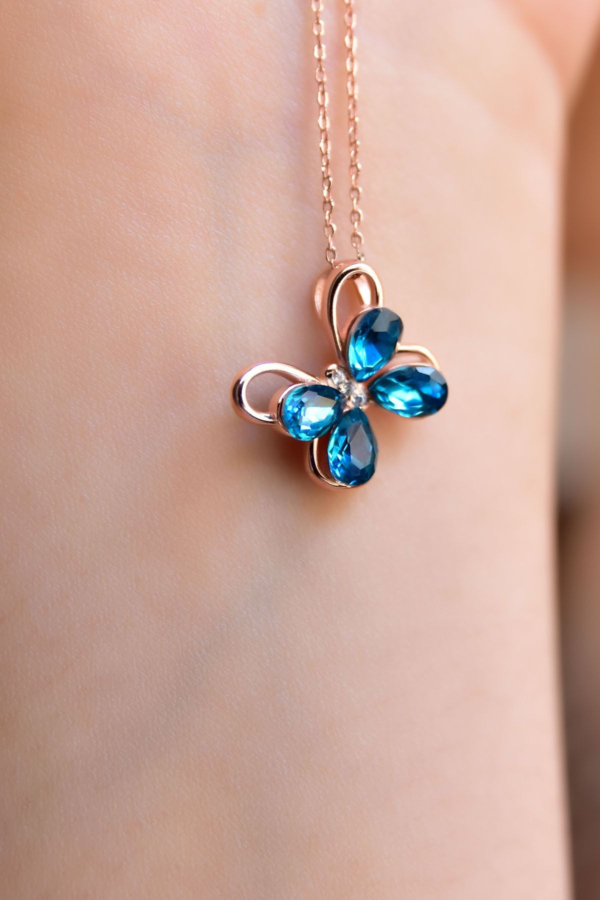 925 Ayar Gümüş Rose Kaplama Zirkon Taşlı Mavi Morpho Kelebeği Kolye