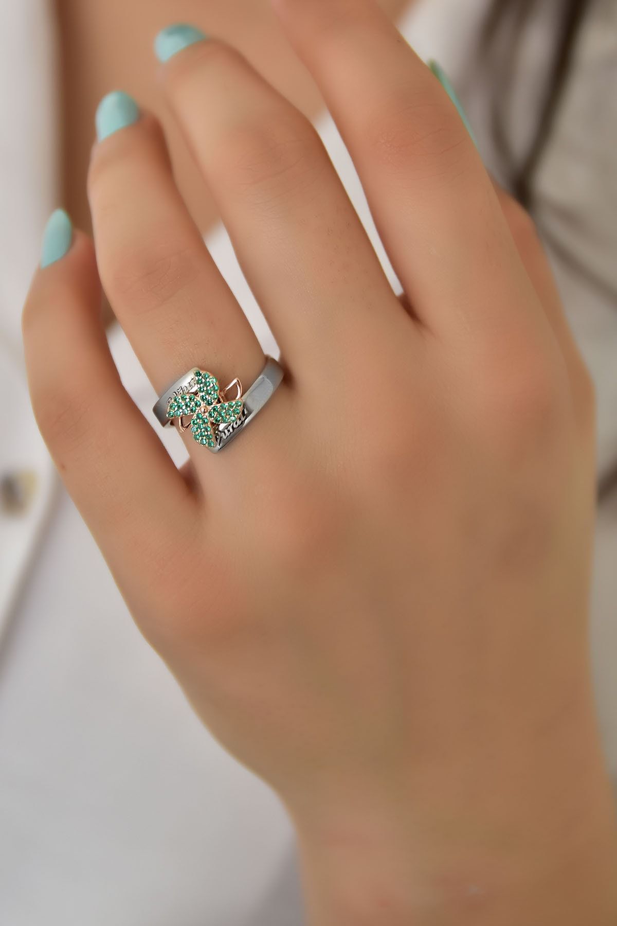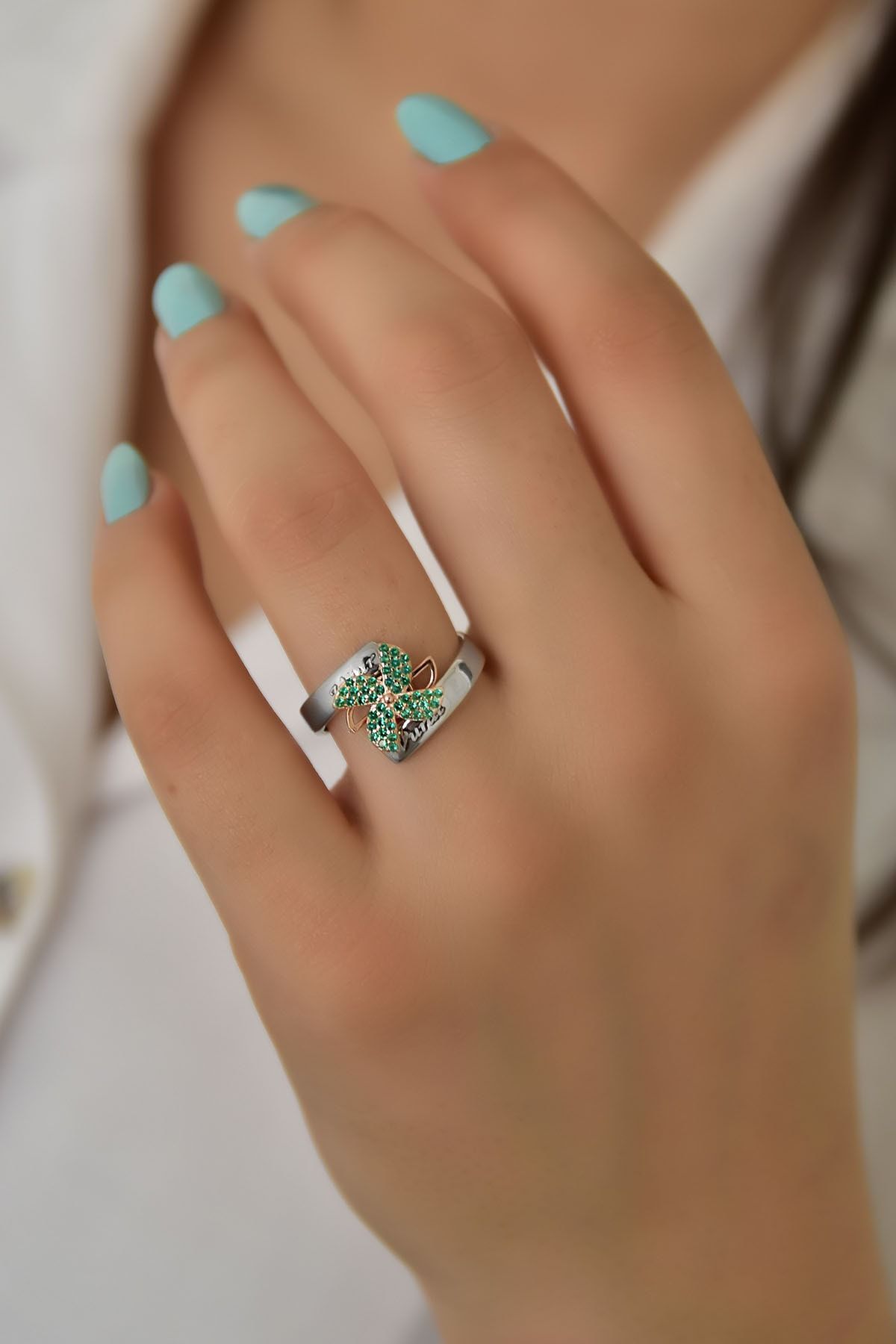 Etiketler925 Ayar Gümüş Rose Rodyum Kaplama Isimli Yeşil Zirkon Taşlı Dönen Pervane Yüzük