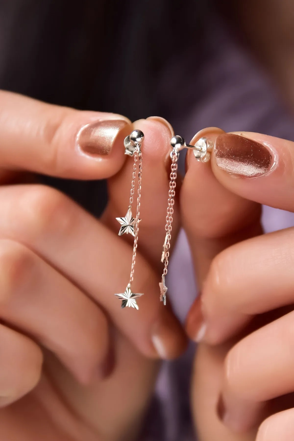 925 Ayar Gümüş Rose-Rodyum Kaplama Kalemli Çift Zincir Yıldız Küpe