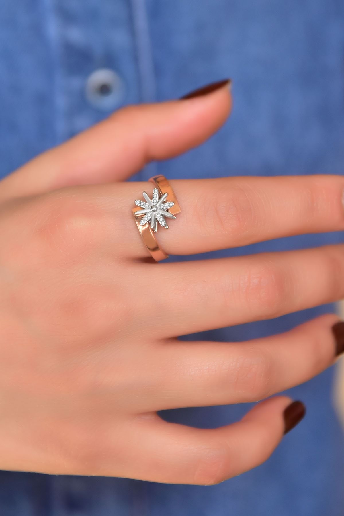 925 Ayar Gümüş Rose Rodyum Kaplama Zirkon Taşlı Dönen Güneş Yüzük