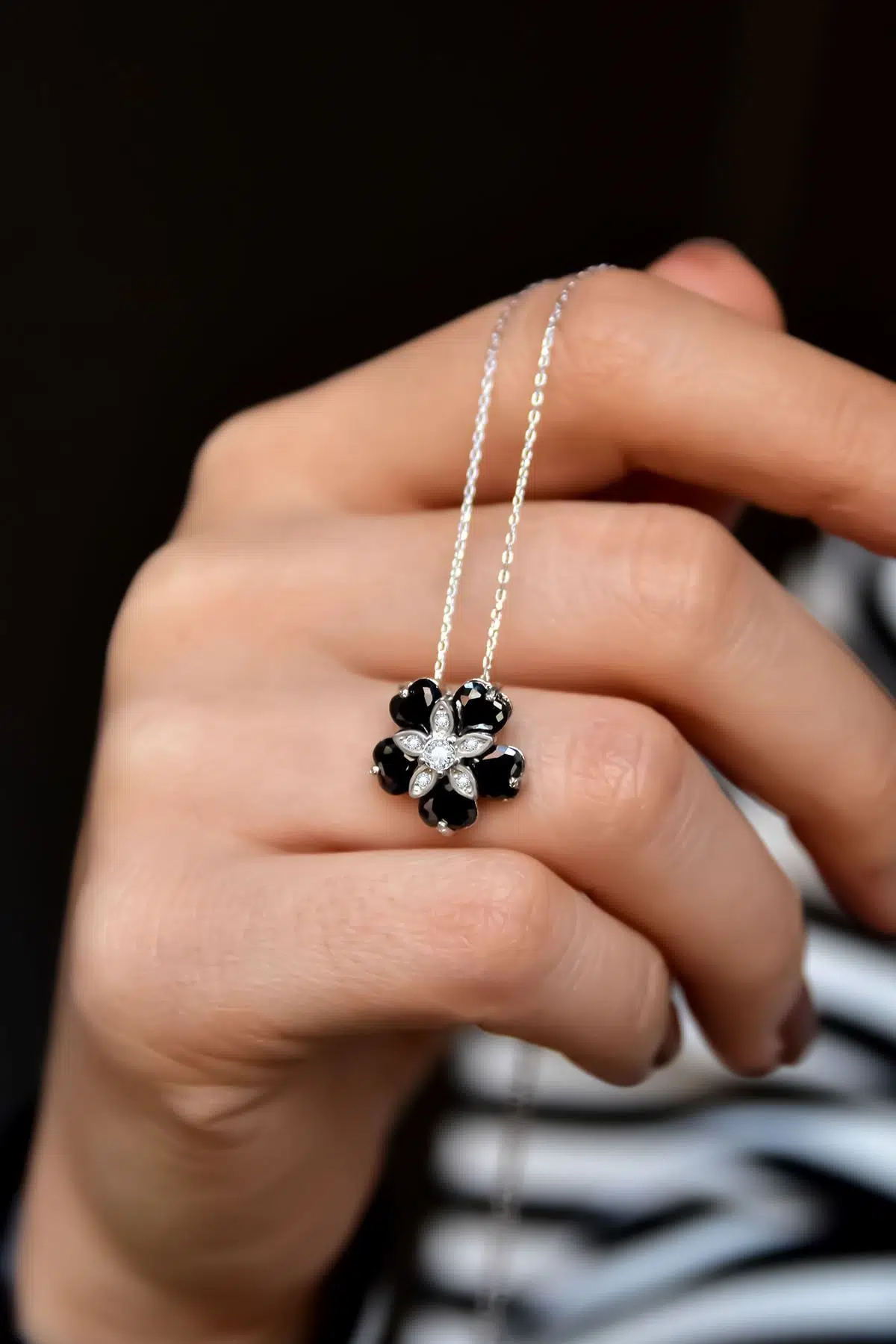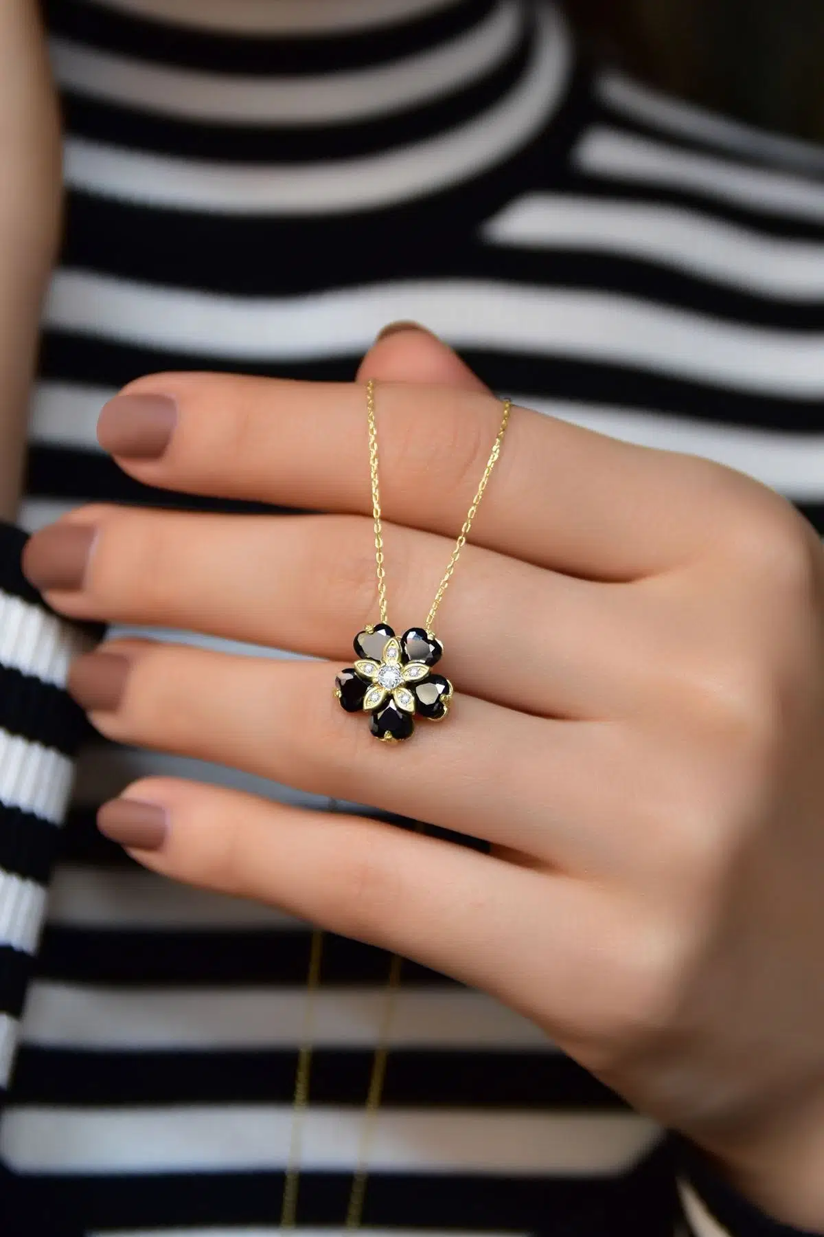 925 Ayar Gümüş Siyah Taşlı Mine Çiçeği Kadın Kolye.rose.gold.rodaj