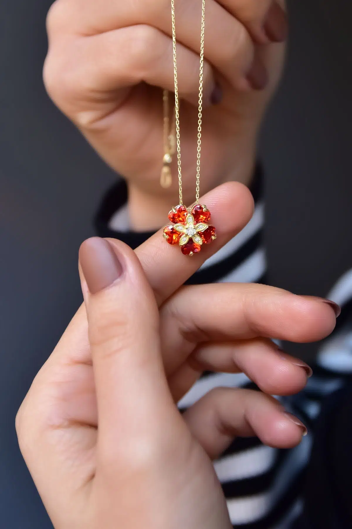 Etiketler925 Ayar Gümüş Turuncu Taşlı Mine Çiçeği Kadın Kolye.rose.gold.rodaj