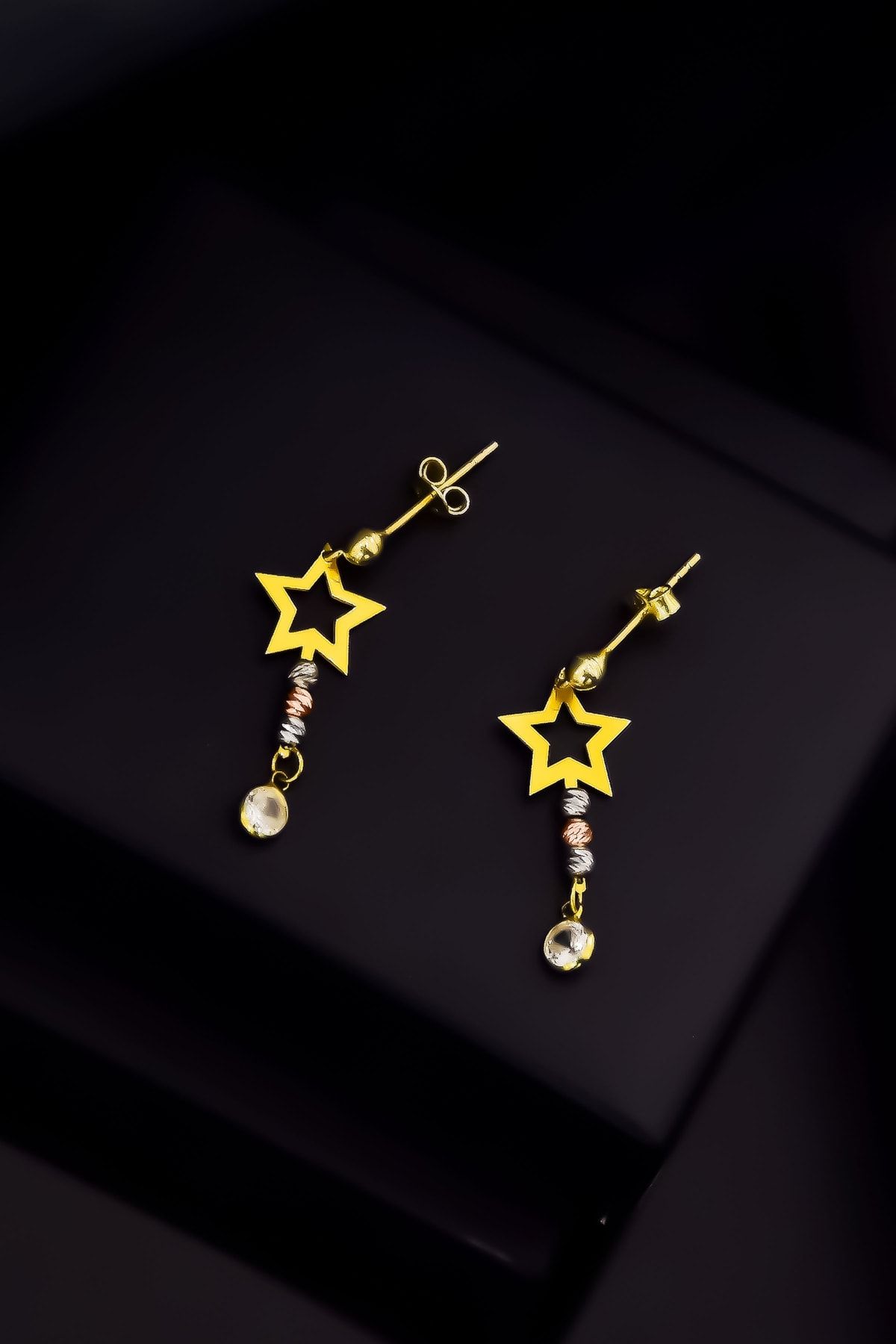 Etiketler925 Ayar Gümüş Üç Renk Dorika Toplu, Zirkon Taş Sallantılı Yıldız Çivili Küpe