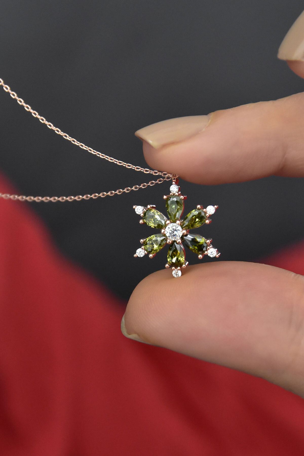 Maden : 925 Ayar Gümüş.Kaplama: Rose Altın. .Renk : Yeşil, Beyaz.Taş: Zirkon.Ürün Ebat En x Boy: 1,5 x 1,5 cm.Zincir Uzunluğu: 42 cm.Ürün Ağırlığı : 2,35 Gr ( +-). Gümüş ve değerli taşlar nedeniyle belirtilen ortalama ürün ağırlığında ± %5 sapma olabilmektedir.Teslimat: Ürün ahşap hediye kutusunda gönderilecektir.Kullanım: Parfüm,dezenfektan,çamaşır suyu gibi kimyasallardan uzak tutunuz.