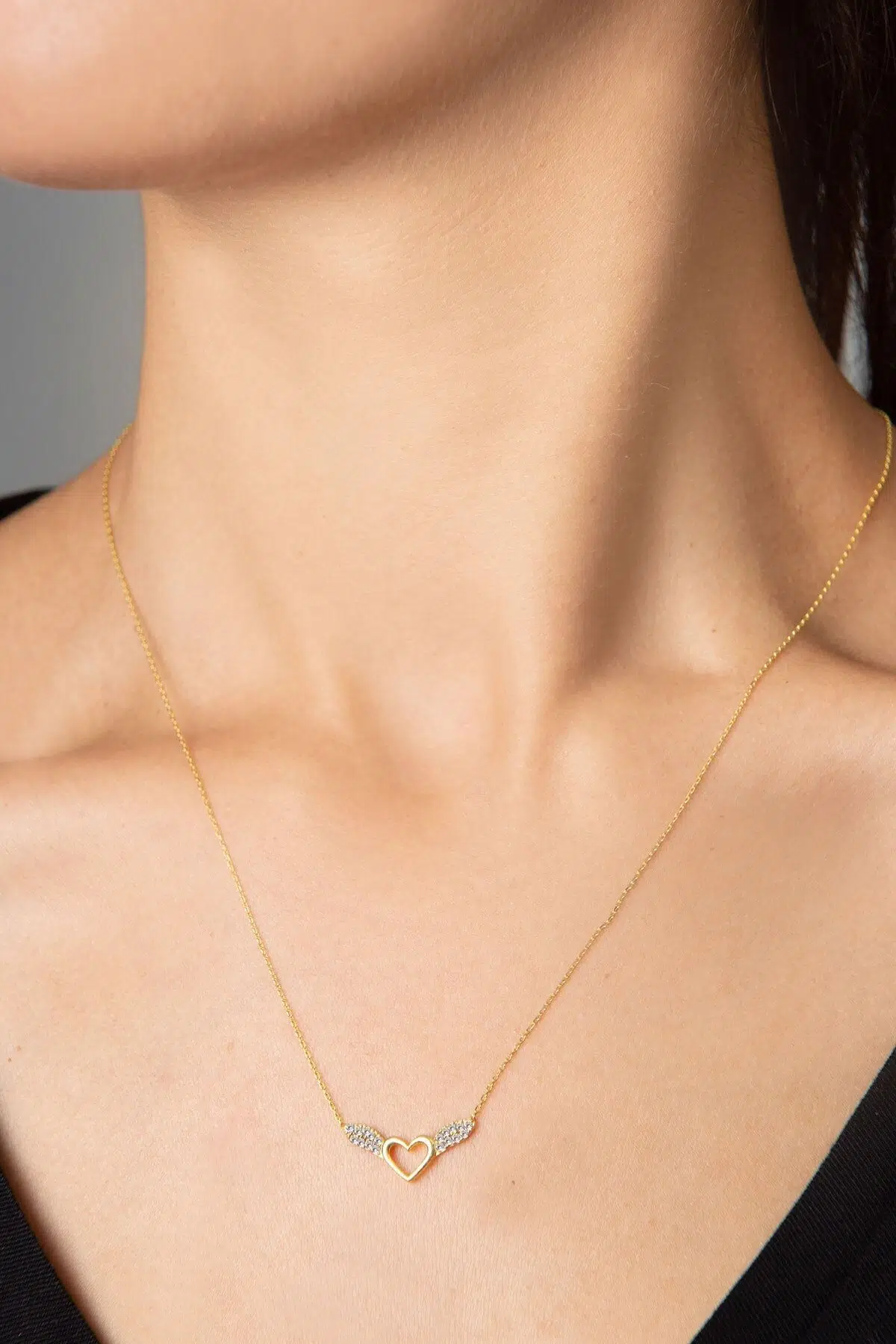 925 Ayar Melek Kanadı Gümüş Kalp Kolye.Maden : 925 Ayar Gümüş.Kaplama: Altın. .Renk : Altın.Taş: Zirkon.Zincir Uzunluğu: 42 cm.Ürün Ağırlığı : 2,50 Gr ( +-). Gümüş ve değerli taşlar nedeniyle belirtilen ortalama ürün ağırlığında ± %5 sapma olabilmektedir.Teslimat: Ürün ahşap hediye kutusunda gönderilecektir.