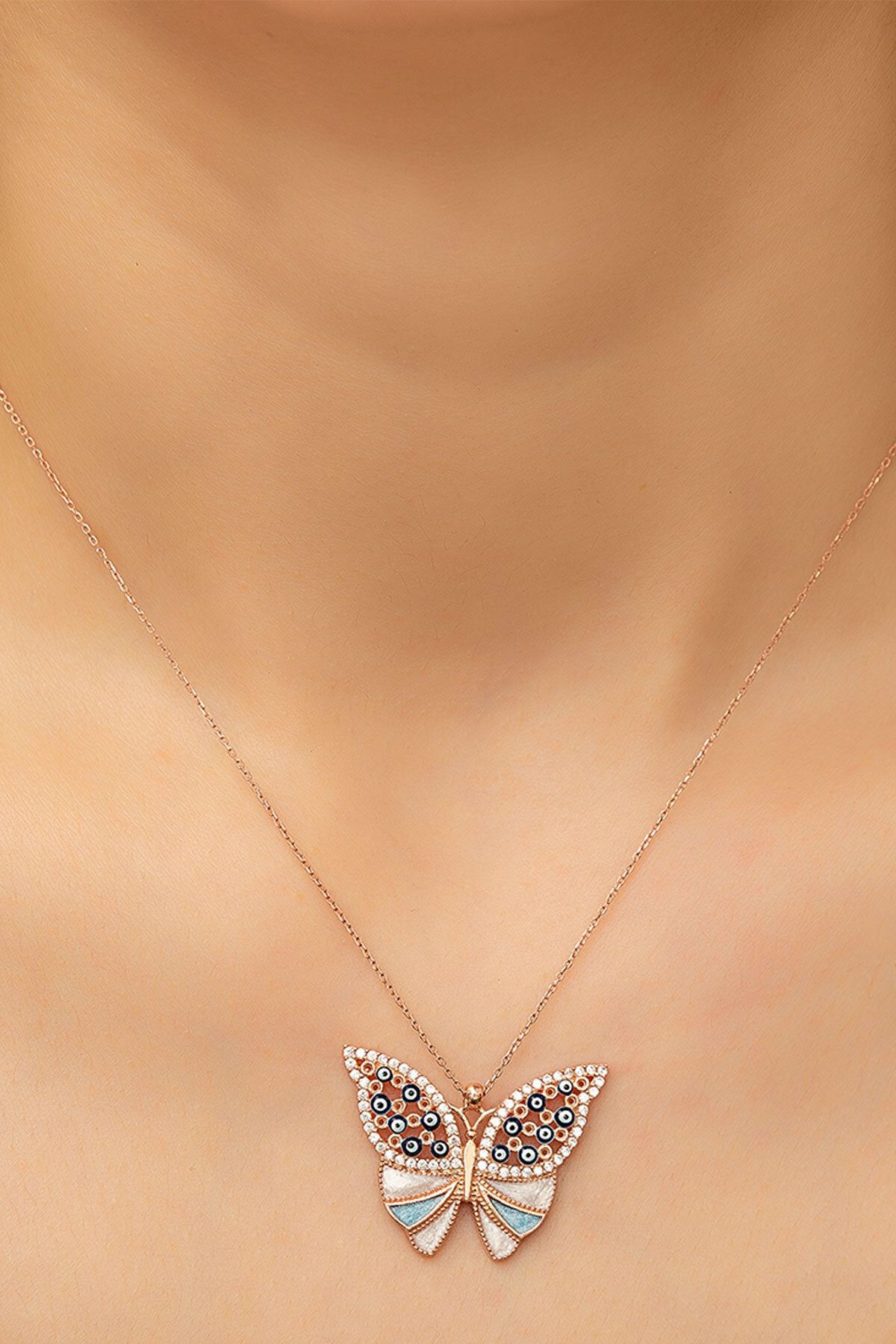 925 Ayar Mineli Gümüş Kelebek Kolye Maden : 925 Ayar Gümüş Kaplama: Rose Altın Renk : Rose Altın Taş: Zirkon Zincir uzunluğu : 43 cm. Ürün ağırlığı : 3,50. Gr (+-). Teslimat : Papatya Silver tarafından ürün kutusunda gönderilecektir.