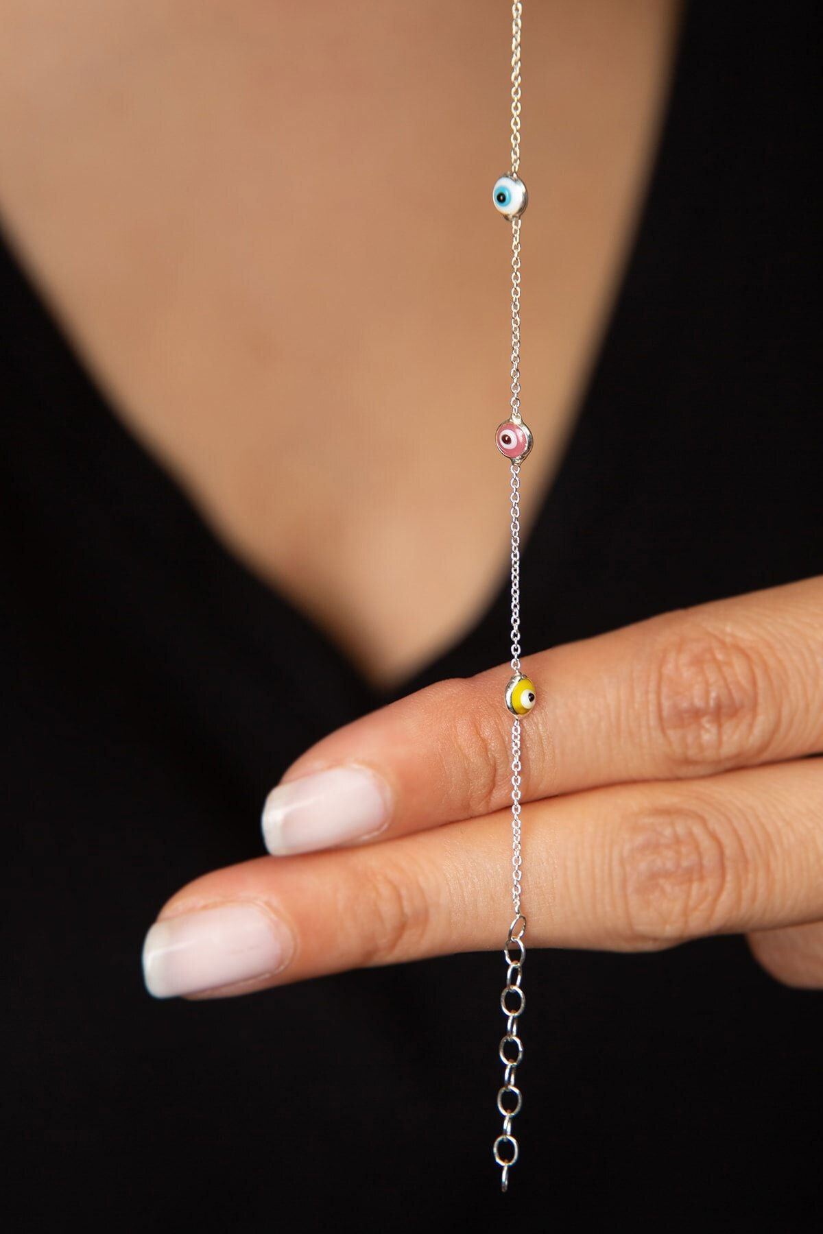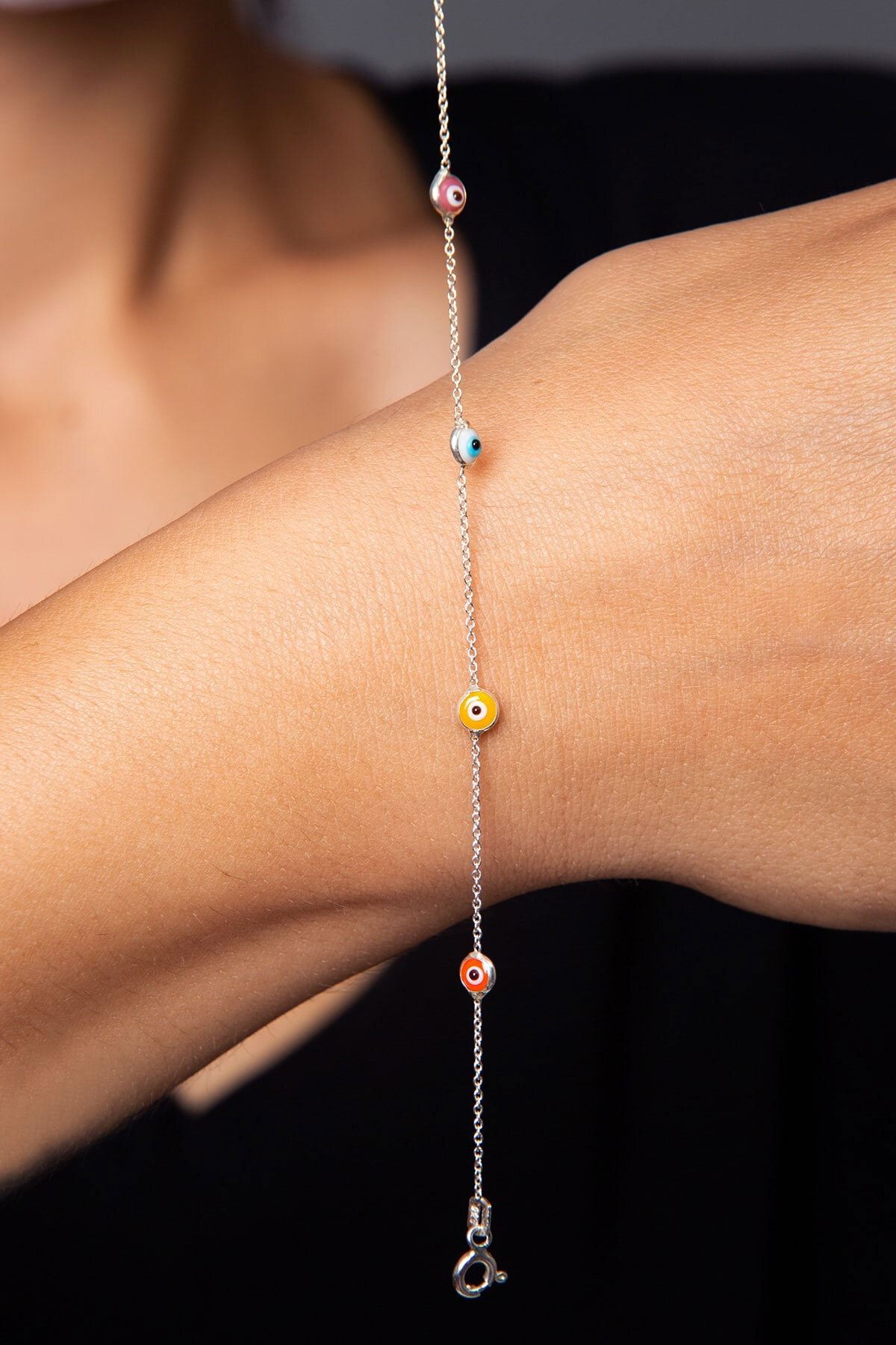 925 Ayar Nazar Boncuklu Gümüş Bileklik.Maden : 925 Ayar Gümüş.Kaplama: Rodyum. Renk : Gümüş.Taş: Mine.Ürün Ağırlığı : 2,00 Gr ( +-). Gümüş ve değerli taşlar nedeniyle belirtilen ortalama ürün ağırlığında ± %5 sapma olabilmektedir.Teslimat: Ürün ahşap hediye kutusunda gönderilecektir.