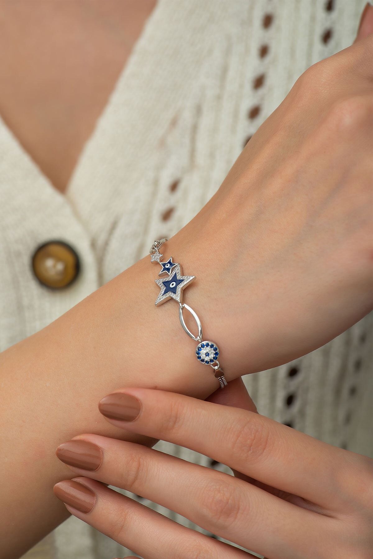 925 Ayar Nazar Boncuklu Yıldız Kadın BileklikMaden : 925 Ayar Gümüş.Kaplama: Rodyum.Renk : Gümüş.Taş: Zirkon.Zincir uzunluğu : 18 cm + ( 3 cm uzatma zinciri )Ürün Ağırlığı : 5,00 Gr ( +-). Gümüş ve değerli taşlar nedeniyle belirtilen ortalama ürün ağırlığında ± %5 sapma olabilmektedir.Teslimat: Ürün ahşap hediye kutusunda gönderilecektir.