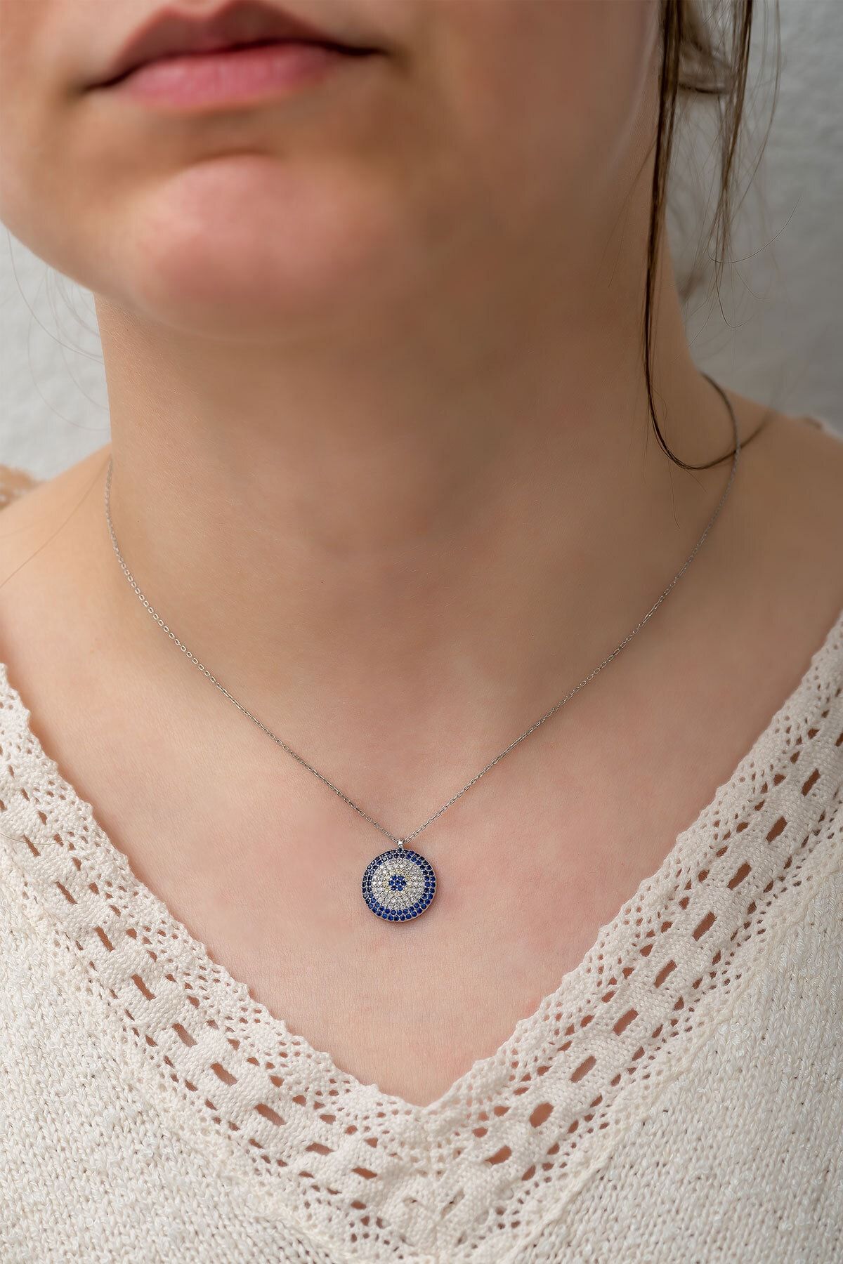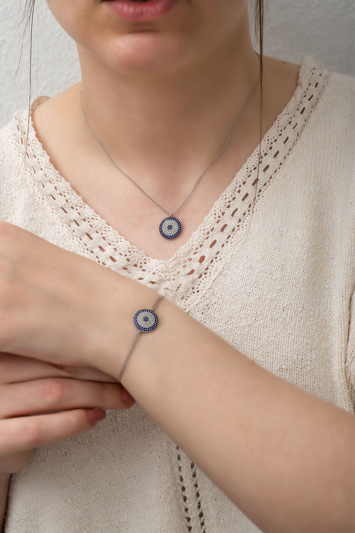 925 Ayar Nazar Kolye Bileklik Gümüş Set.Maden : 925 Ayar gümüş.Kaplama : Rodyum.Renk : Gümüş.Taş:ZirkonÜrün ağırlığı : 6.50 Gr ( +-).Kolye Zincir Uzunluğu : 42 cm.Bileklik Uzunluğu:18 + 5cm.Teslimat :Ürün hediye kutusunda gönderilecektir.