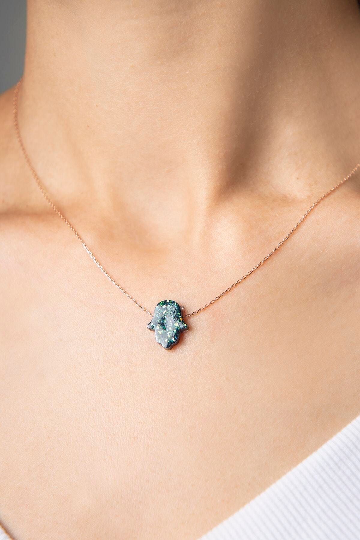 925 Ayar Opal Taşlı Fatma Ana Eli Gümüş Kolye. Maden : 925 Ayar Gümüş. Kaplama: Rose Altın. Renk : Altın. Taş: Opal Zincir Uzunluğu: 42 cm. Ürün Ağırlığı : 2,50 Gr ( +-). Gümüş ve değerli taşlar nedeniyle belirtilen ortalama ürün ağırlığında ± %5 sapma olabilmektedir.