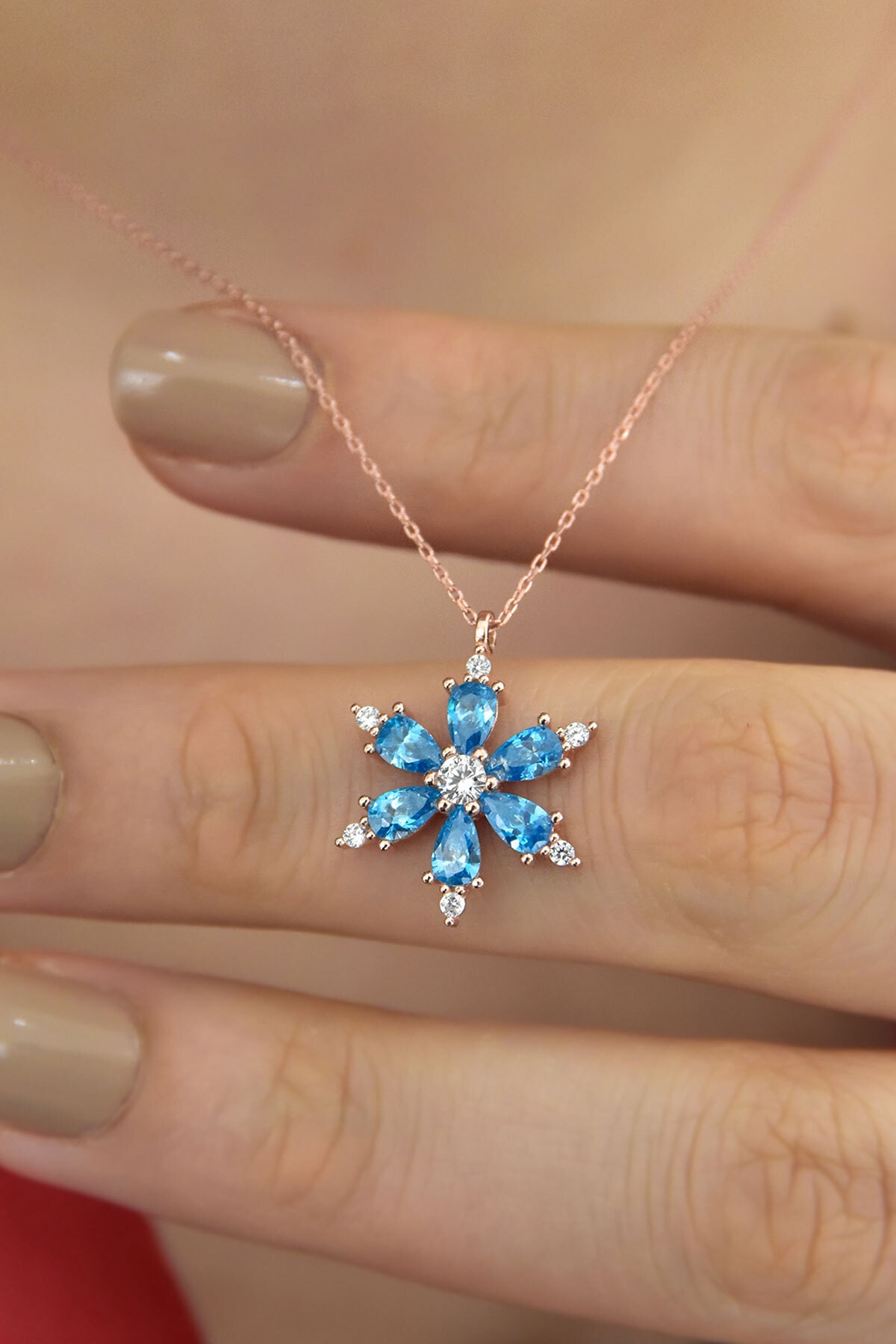 Maden Ayar: 925 Ayar Gümüş.Maden Kaplama: Rose Altın. Ürün Ebat En x Boy: 1,5 x 1,5 cm.Ağırlık: 2,40 Gr. (-+). Zincir Uzunluğu: 42 cm. Taş: Zirkon.Taş Renk Açık Mavi. Teslimat: Ürün ahşap hediye kutusunda gönderilecektir.''Gümüş ürünlerin yapısı gereği kararmalar meydana gelebilir daha uzun ömürlü olması için;Parfüm gibi kozmetik ürünlere direkt temas etmediği sürece ürün ömrü daha uzun olacaktır.''