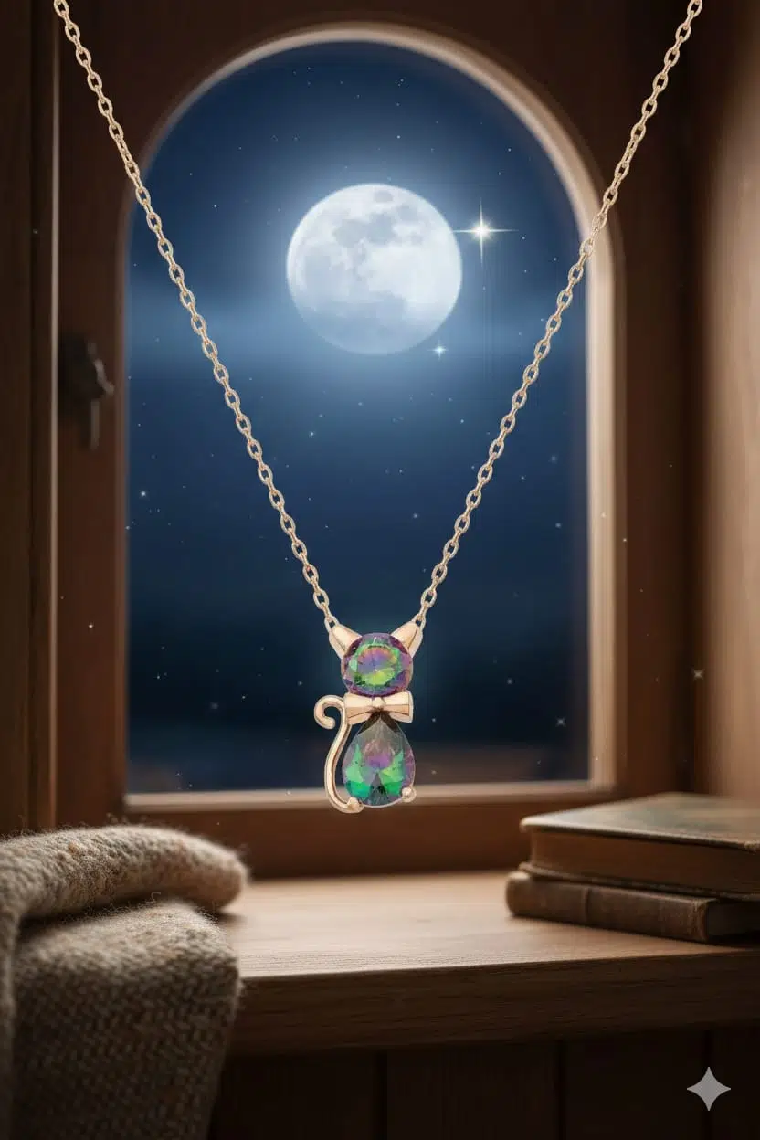 925 Ayar Rose Altın Kaplama Mistik Topaz Taşlı Gümüş Kedi KolyeMaden : 925 Ayar gümüş.Kaplama : Rose Altın.Renk : Rose Altın.Taş: Mistik TopazÜrün ağırlığı : 2,50 Gr ( +-).Zincir Uzunluğu: 42 cm.Teslimat :Ürün hediye kutusunda gönderilecektir.