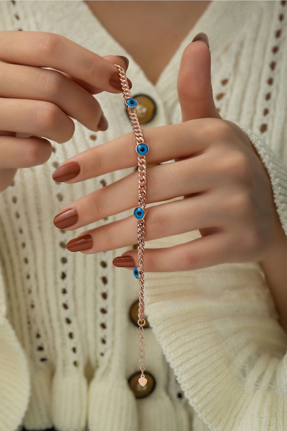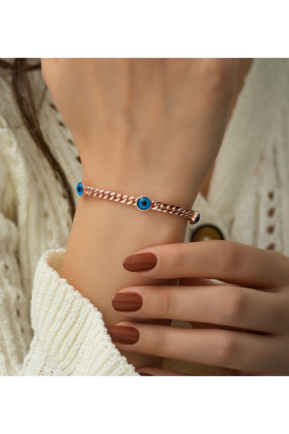 925 Ayar Rose Altın Kaplama Nazar Gözlü Gümüş Zincir Bileklik. Maden : 925 Ayar Gümüş.Kaplama: Rose Altın.Renk : Rose Altın. Taş: Mine. Teslimat: Ürün ahşap hediye kutusunda gönderilecektir.