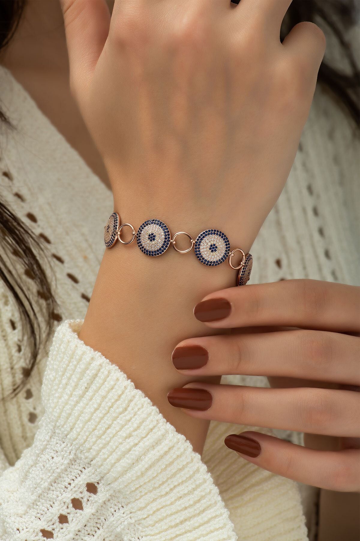 925 Ayar Rose Altın Kaplama Nazar Gümüş Bileklik. Maden : 925 Ayar Gümüş.Kaplama: Rose Altın.Renk : Altın. Taş: Zirkon. Teslimat: Ürün ahşap hediye kutusunda gönderilecektir.