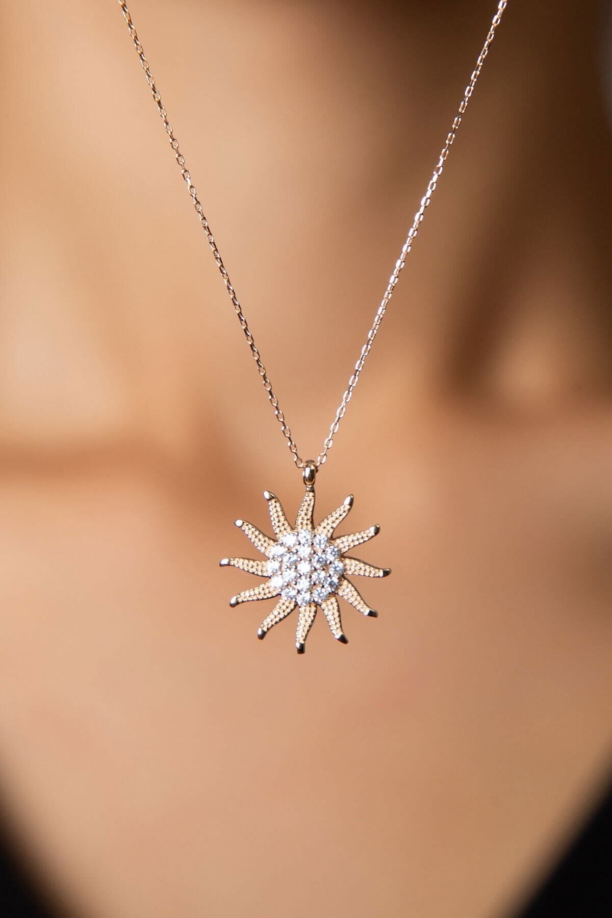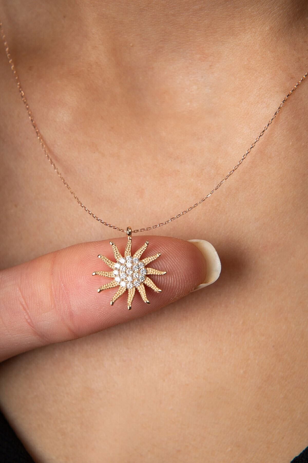 925 Ayar Rose Altın Kaplama Zirkon Taşlı Gümüş Güneş Kolye.Maden : 925 Ayar Gümüş.Kaplama: Rose Altın. .Renk : Altın.Taş: Zirkon.Zincir Uzunluğu: 42 cm.Ürün Ağırlığı : 2,00 Gr ( +-). Gümüş ve değerli taşlar nedeniyle belirtilen ortalama ürün ağırlığında ± %5 sapma olabilmektedir.Teslimat: Ürün kutusunda gönderilecektir.