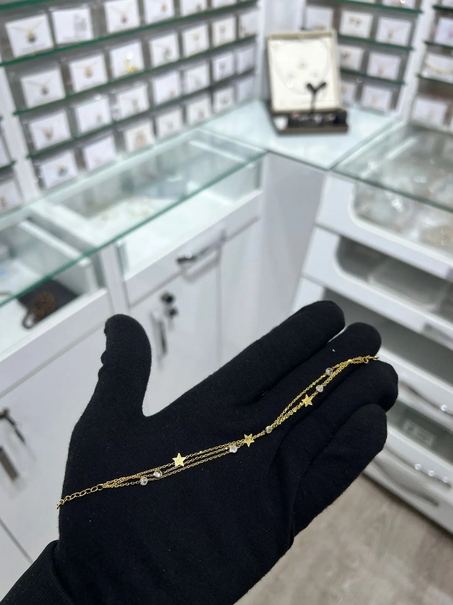 925 Ayar Rose Altın Kaplama Zirkon Taşlı Yıldız Gümüş,yıldız bileklik BileklikMaden : 925 Ayar Gümüş.Kaplama : Rose Alın.Renk: Altın.Taş: Zirkon.Bileklik Zincir Uzunluğu : 16 + 3 cm.Ürün ağırlığı : 3,00 Gr ( +-). Gümüşve değerli taşlar nedeniyle belirtilen ortalama ürün ağırlığında ± %5 sapma olabilmektedir.Teslimat :Ürün hediye kutusunda gönderilecektir.