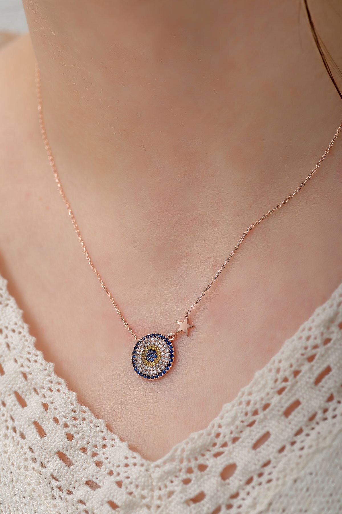 925 Ayar Rose Altın Yıldızlı Küçük Gümüş Nazar Kolye