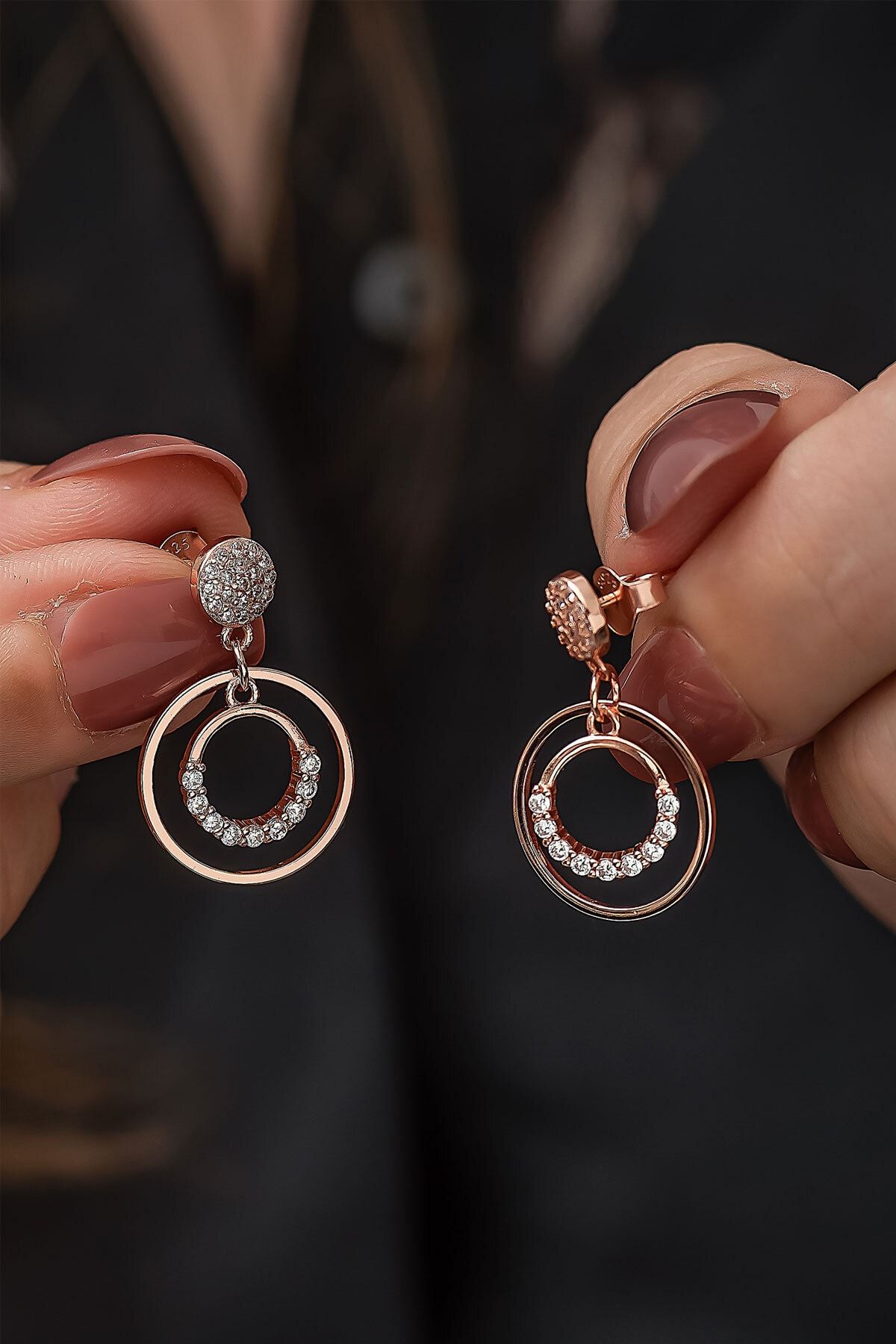 925 Ayar Rose Kaplama Çift Halka Taşlı Sallantılı Gümüş Küpe