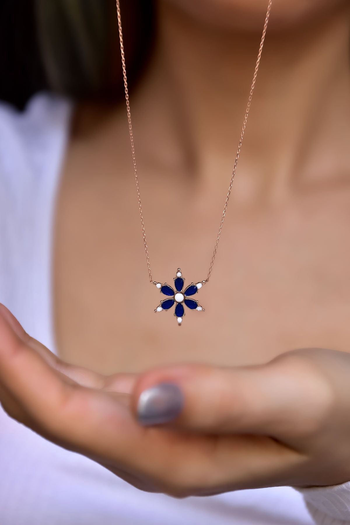 Etiketler925 Ayar Rose Kaplama Lacivert Sedef Mineli Kamelya Çiçeği Kolye