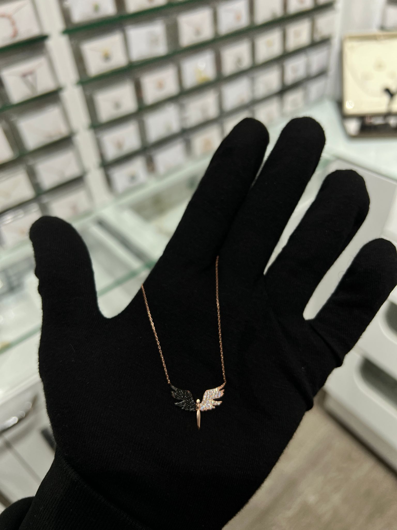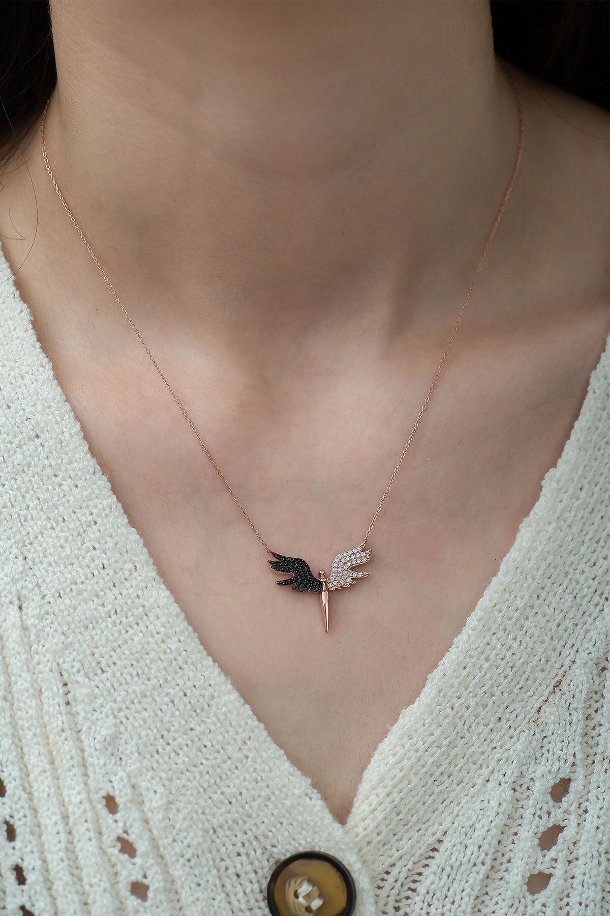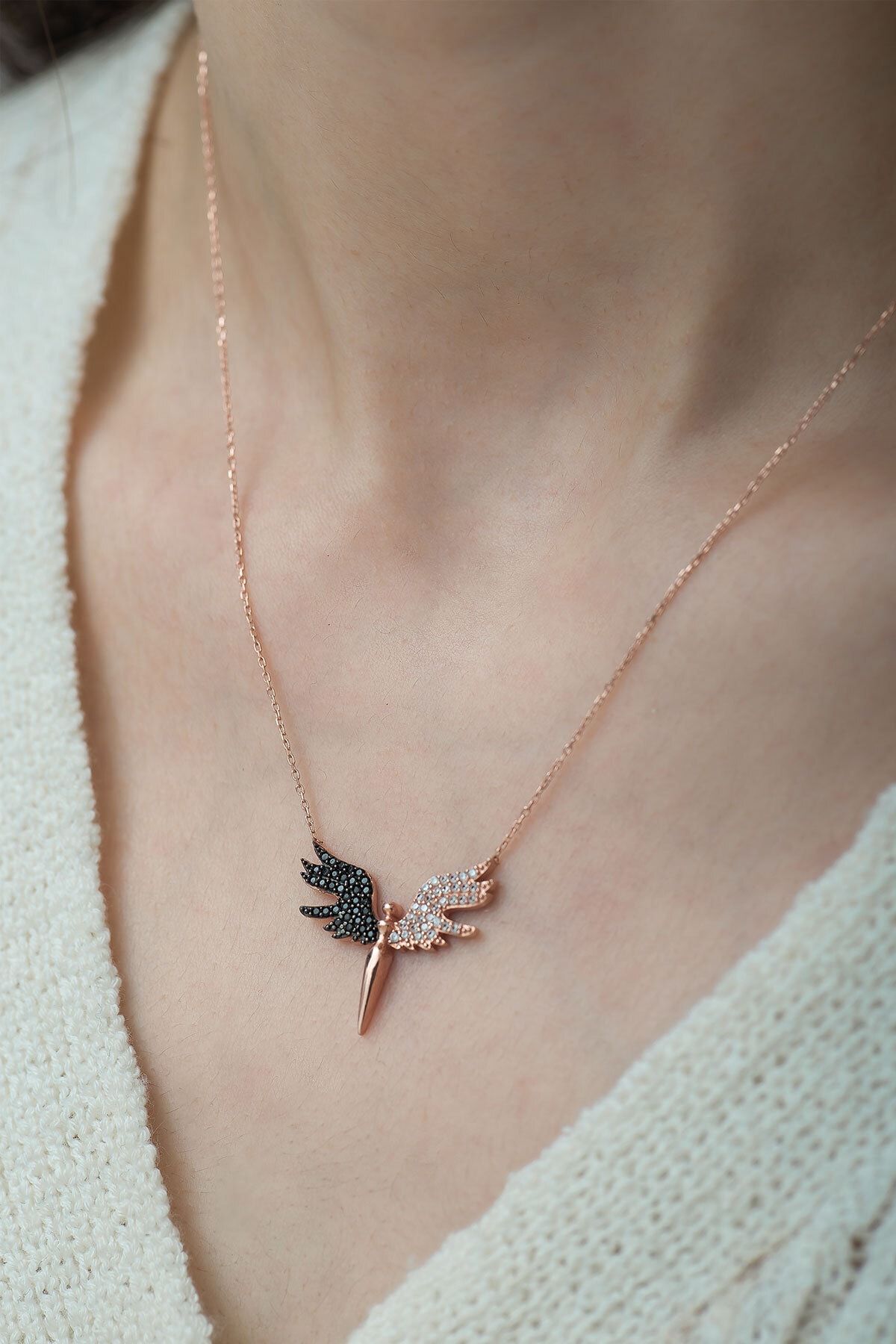 925 Ayar Siyah Beyaz Taşlı Gümüş Melek KolyeMaden : 925 Ayar Gümüş.Kaplama: Rose Altın.Renk : Altın.Taş: Zirkon.Zincir Uzunluğu: 42 cm.Ürün Ağırlığı : 2,70 Gr ( +-). Gümüş ve değerli taşlar nedeniyle belirtilen ortalama ürün ağırlığında ± %5 sapma olabilmektedir.Teslimat: Ürün ahşap hediye kutusunda gönderilecektir.