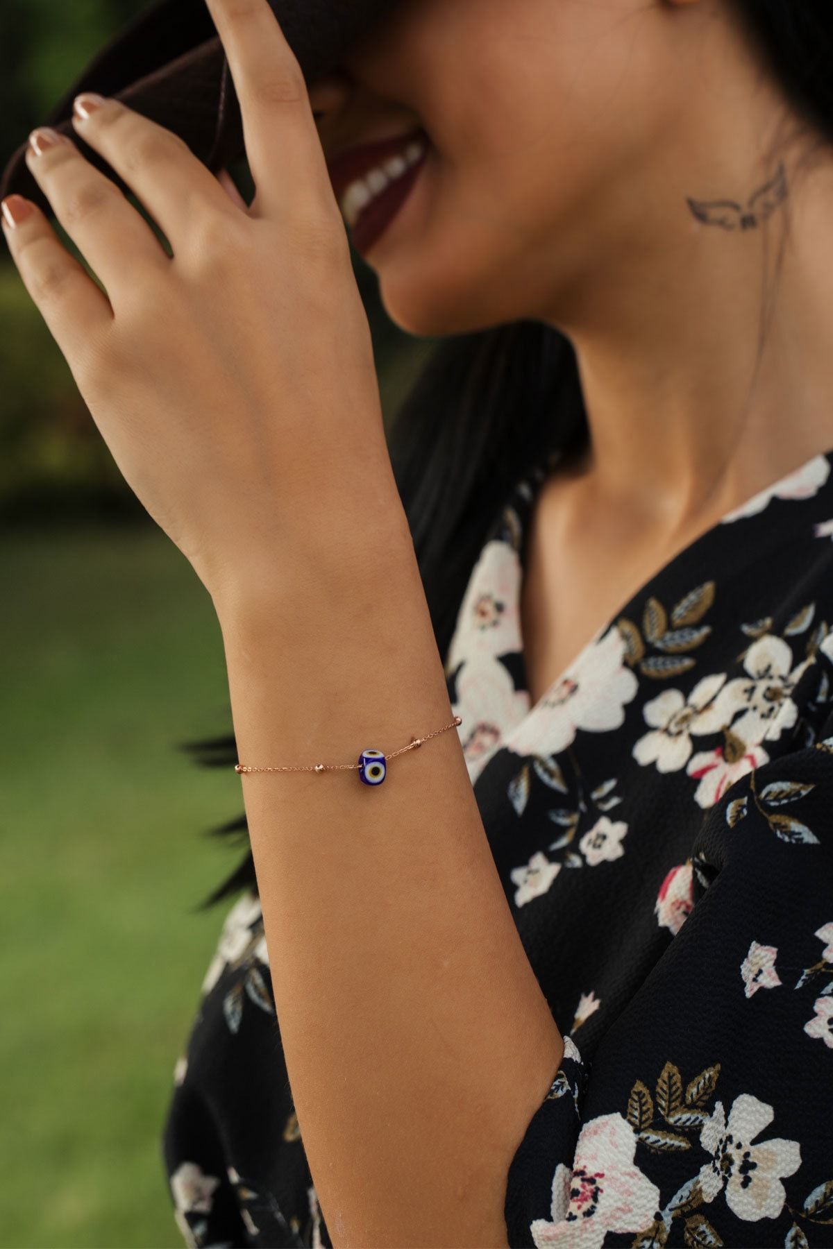 925 Ayar Top Zincirli Nazar Boncuklu Gümüş BileklikMaden : 925 Ayar GümüşKaplama : Rose Altın KaplamaRenk : Rose AltınBileklik uzunluğu : 18 cm.Ürün ağırlığı : 2,50 gr.( +-).Teslimat: Papatya Silver tarafından Ürün ahşap hediye kutusunda gönderilecektir.