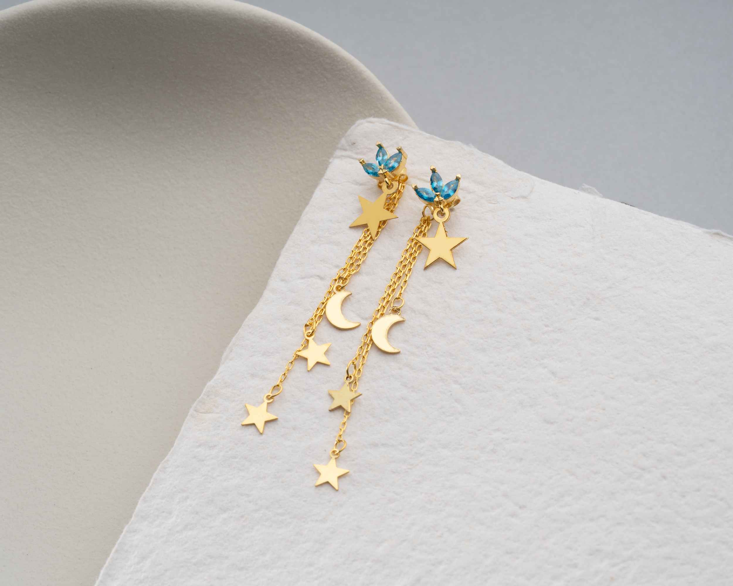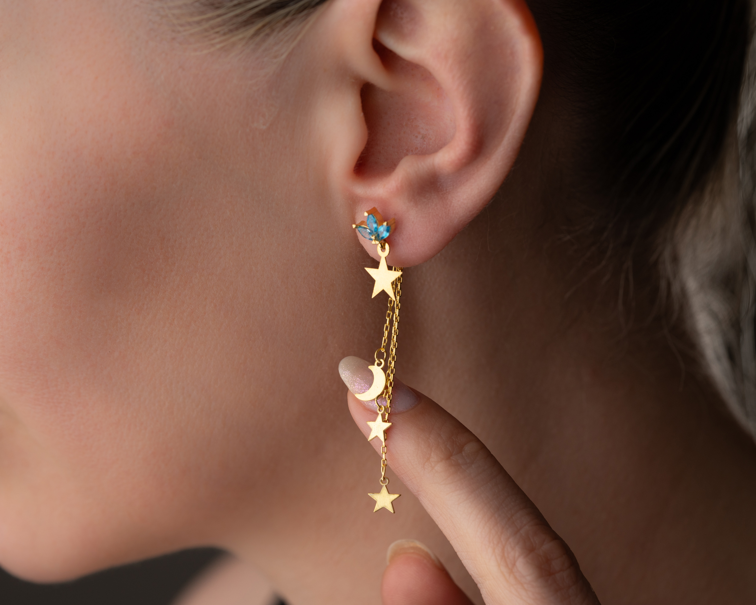 Etiketler925 Ayar Yıldız Figürlü Ay Yıldız Sallantılı Doğum Taşlı Küpe
