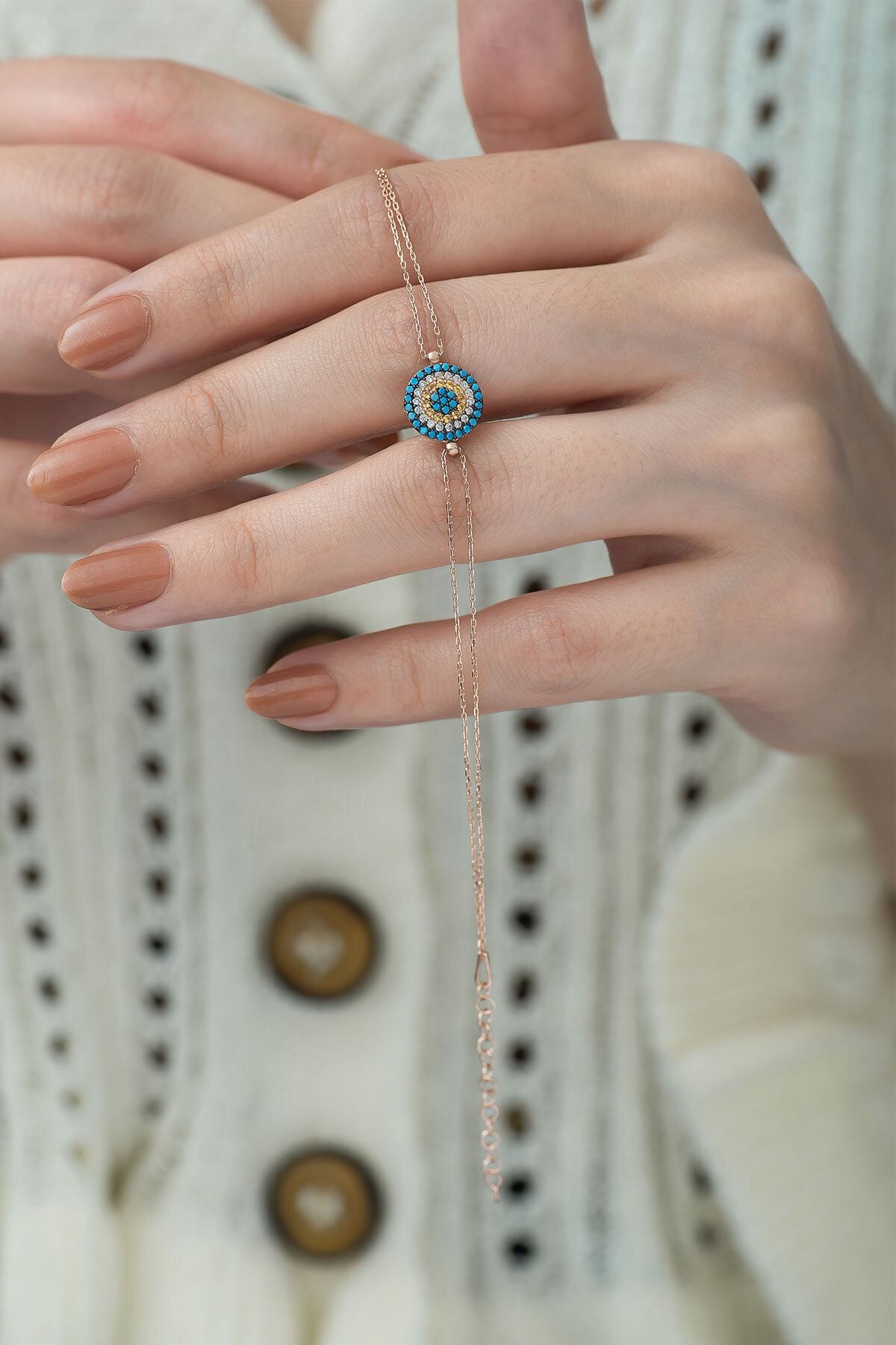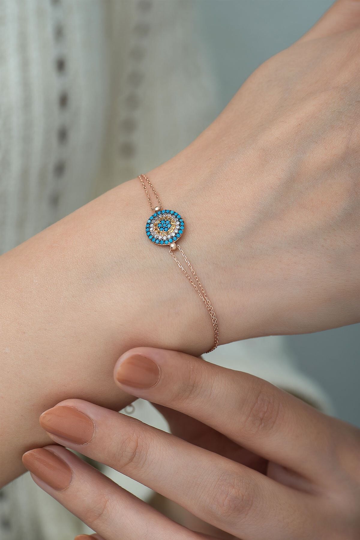 925 Ayar Zirkon Taşlı Gümüş Nazar Bileklik.Maden : 925 Ayar Gümüş.Kaplama: Rose Altın.Renk : Altın.Taş: Zirkon.Ürün Ağırlığı : 3,50 Gr ( +-). Gümüş ve değerli taşlar nedeniyle belirtilen ortalama ürün ağırlığında ± %5 sapma olabilmektedir.Teslimat: Ürün ahşap hediye kutusunda gönderilecektir.