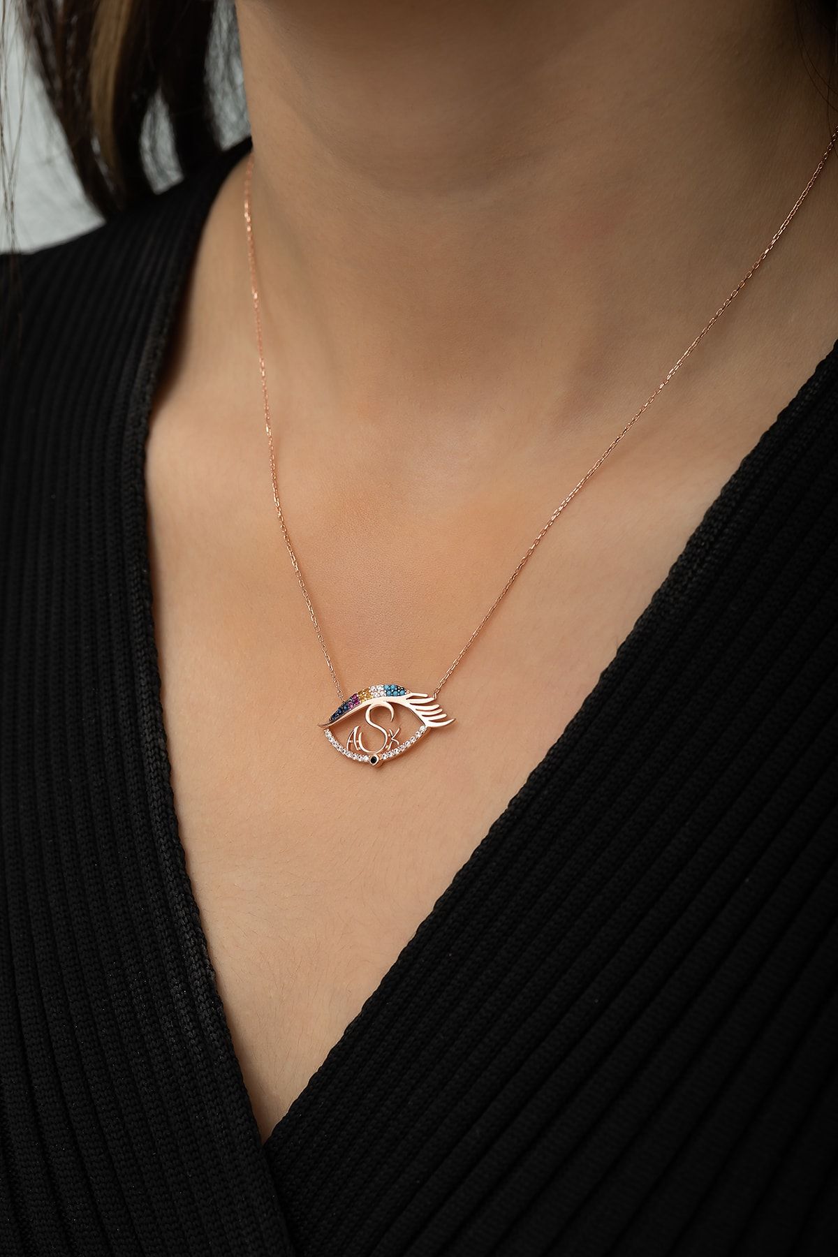 Aşk Yazılı Göz Kolye Renkli Nano Zirkon Rose Gold Kaplama 925 Ayar Gümüş UVPS100505Maden : 925 Ayar GümüşDeğerli Taş : Nano ZirkonKaplama: Rose Altın.Renk : Rose Altın.Zincir uzunluğu : 43 cm (+-) + Uzatma ek zincirÜrün ağırlığı : 4.50 Gr (+-).Teslimat: Papatya Silver tarafından Ürün ahşap hediye kutusunda gönderilecektir.